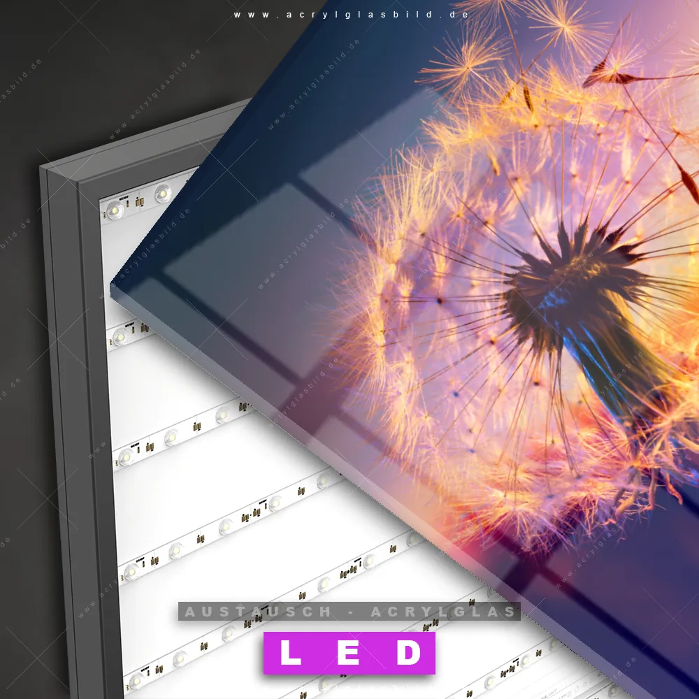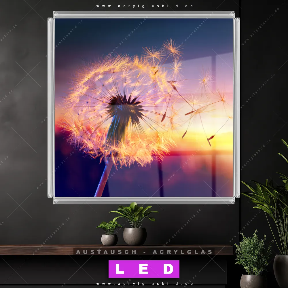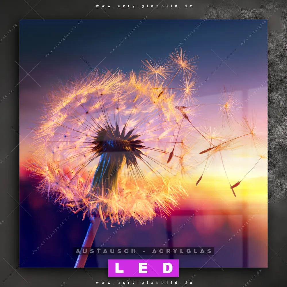 Begriffe wie Blume, Botanik, Pflanze, Natur, Nahaufnahme, Pusteblume, Dandelion, Löwenzahn haben dich auf der Suche nach deinem neuen Austausch-Acrylglasbild inspiriert? Dann sollte das Wechsel-Acrylglasbild Pusteblume mit Sonnenuntergang für dein bereits vorhandenes LED Acrylglasbild Canvalight® DIA den Weg zu dir finden.