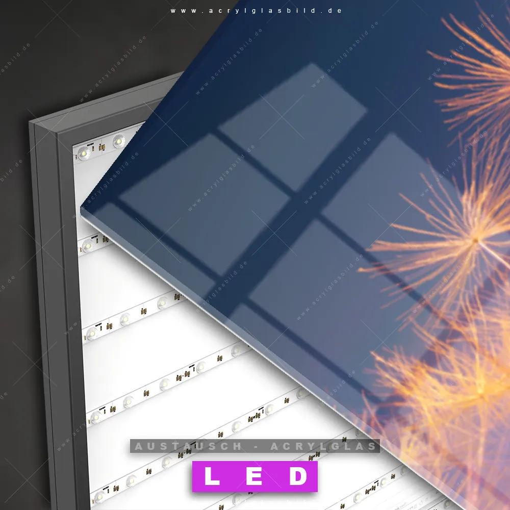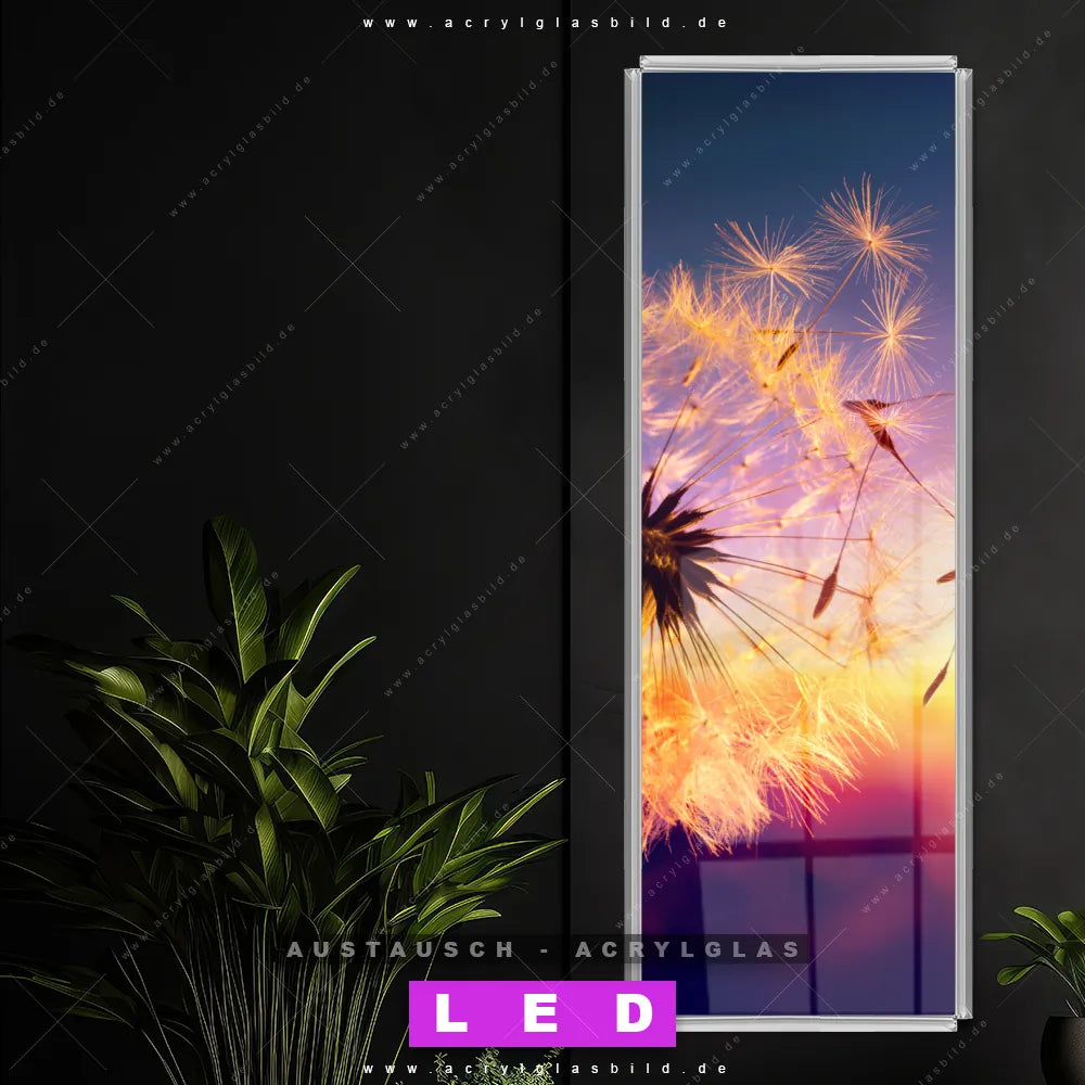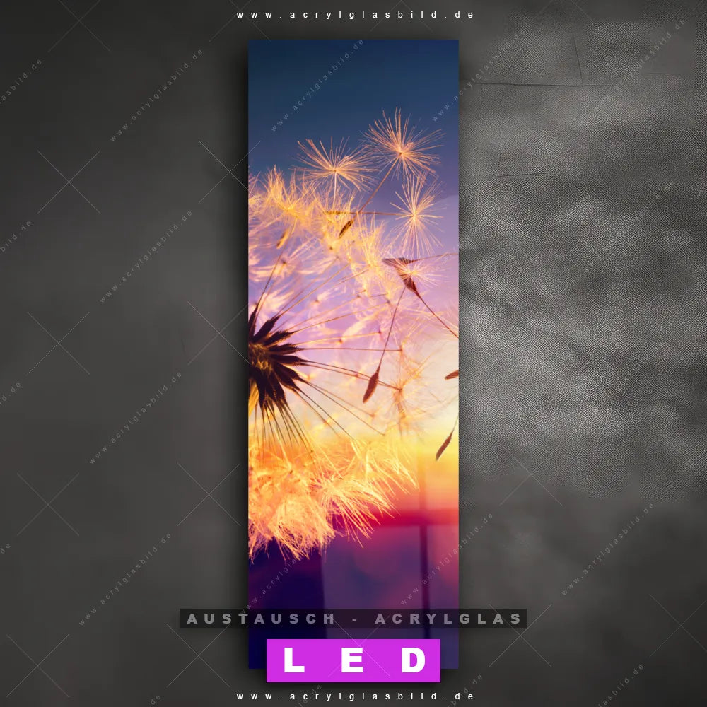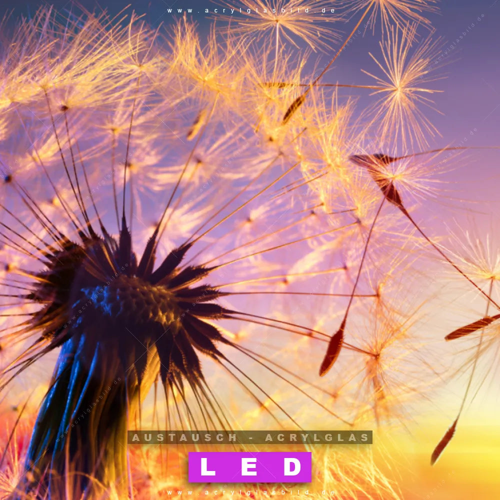 Begriffe wie Blume, Botanik, Pflanze, Natur, Nahaufnahme, Pusteblume, Dandelion, Löwenzahn haben dich auf der Suche nach deinem neuen Austausch-Acrylglasbild inspiriert? Dann sollte das Wechsel-Acrylglasbild Pusteblume mit Sonnenuntergang für dein bereits vorhandenes LED Acrylglasbild Canvalight® DIA den Weg zu dir finden.
