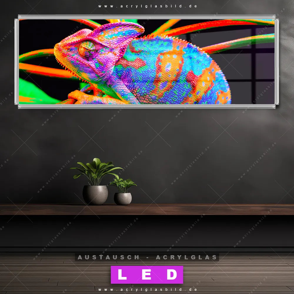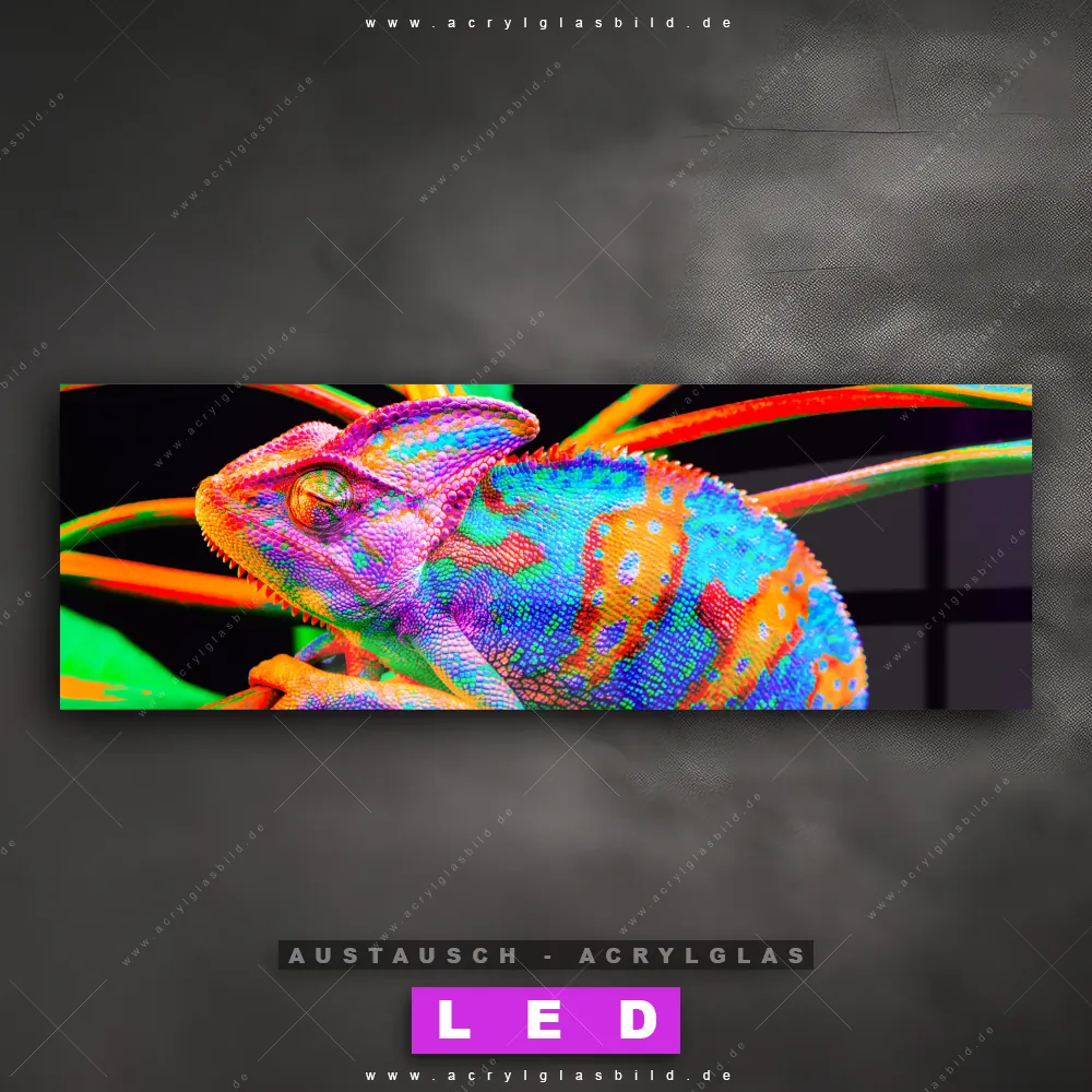 Begriffe wie Tiere, Farbe, bunt, Chamäleon, Regenbogen, Pop Art haben dich auf der Suche nach deinem neuen Austausch-Acrylglasbild inspiriert? Dann sollte das Wechsel-Acrylglasbild farbenfrohes Chamäleon für dein bereits vorhandenes LED Acrylglasbild Canvalight® DIA den Weg zu dir finden.