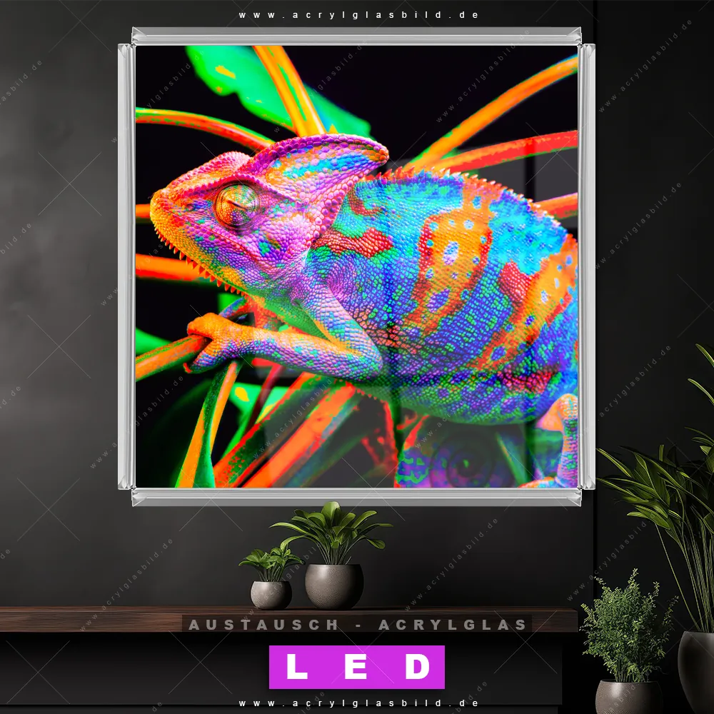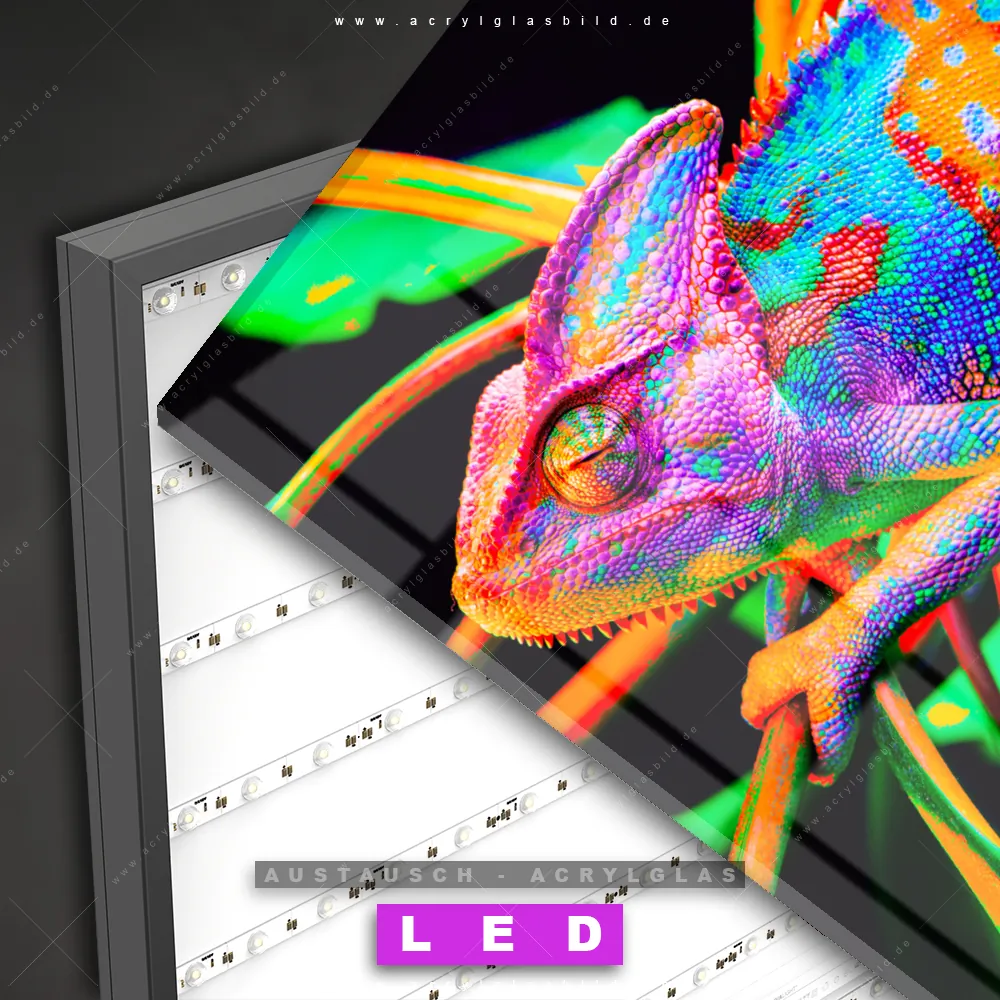 Begriffe wie Tiere, Farbe, bunt, Chamäleon, Regenbogen, Pop Art haben dich auf der Suche nach deinem neuen Austausch-Acrylglasbild inspiriert? Dann sollte das Wechsel-Acrylglasbild farbenfrohes Chamäleon für dein bereits vorhandenes LED Acrylglasbild Canvalight® DIA den Weg zu dir finden.