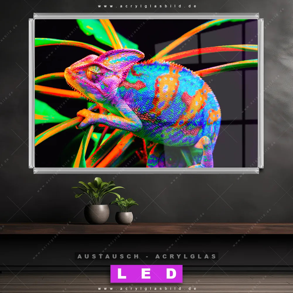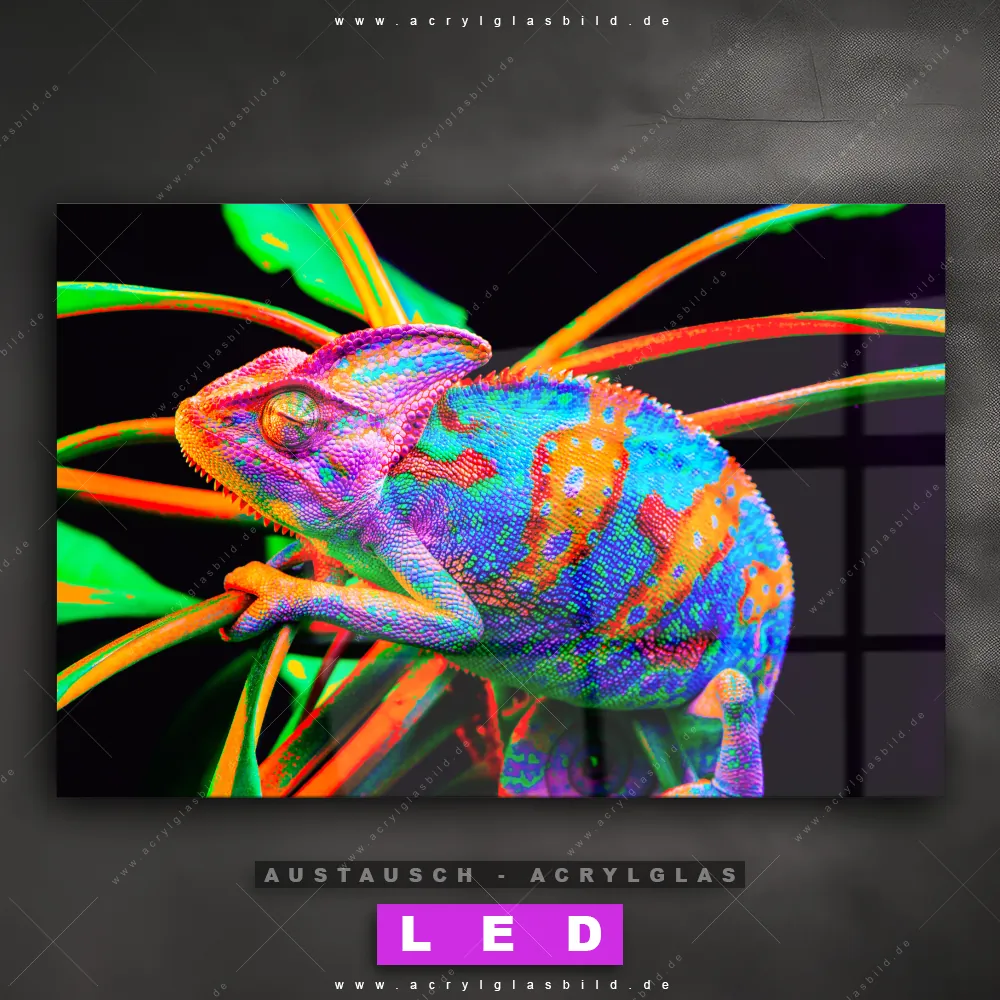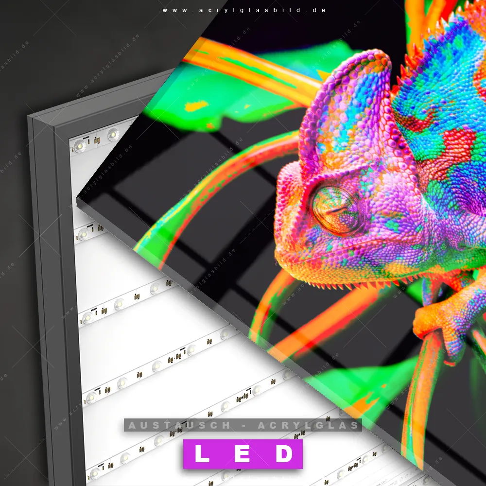 Begriffe wie Tiere, Farbe, bunt, Chamäleon, Regenbogen, Pop Art haben dich auf der Suche nach deinem neuen Austausch-Acrylglasbild inspiriert? Dann sollte das Wechsel-Acrylglasbild farbenfrohes Chamäleon für dein bereits vorhandenes LED Acrylglasbild Canvalight® DIA den Weg zu dir finden.