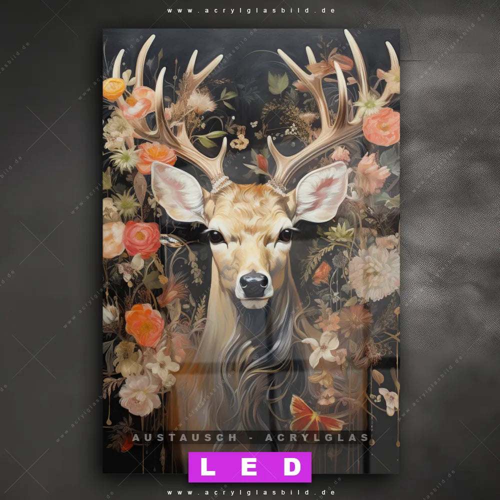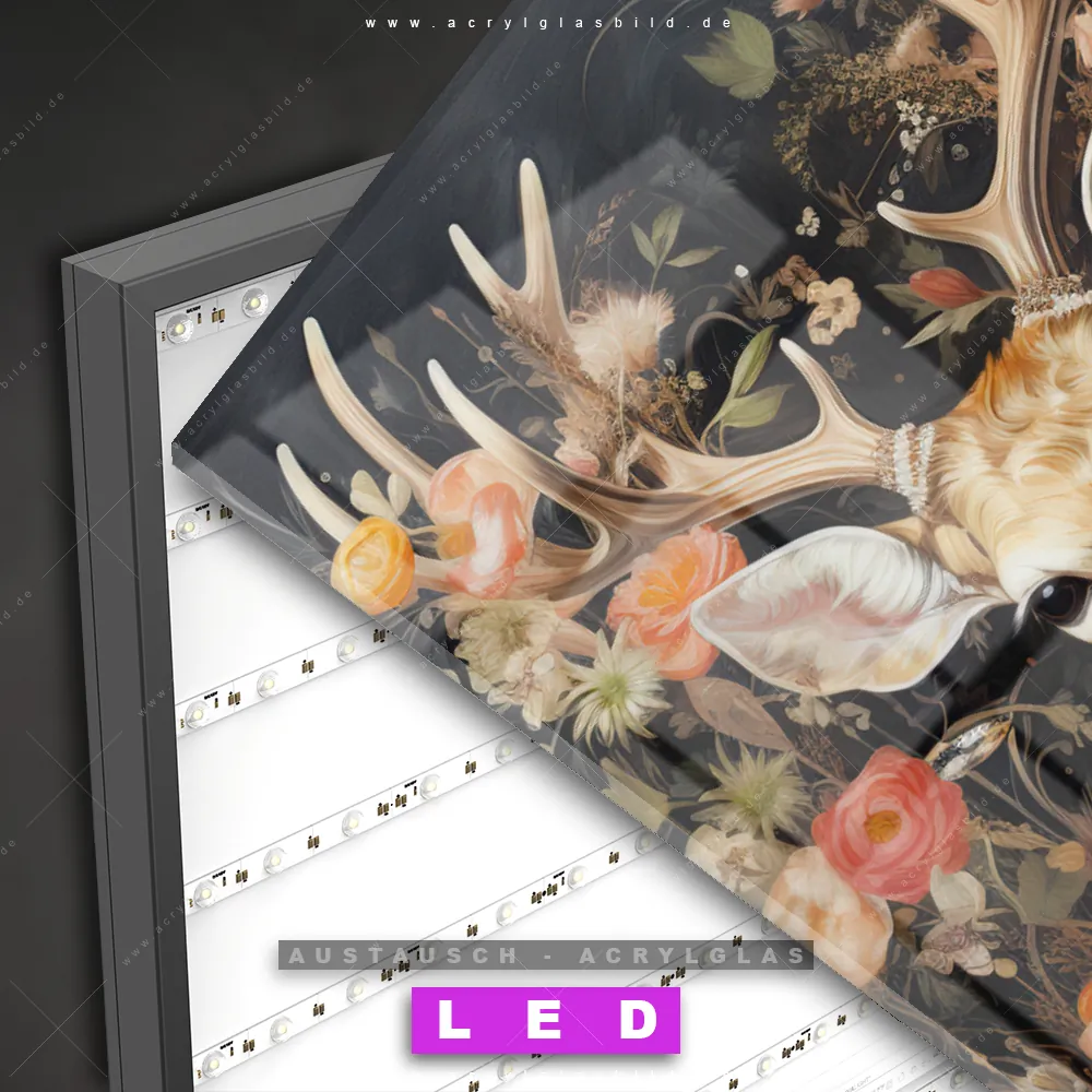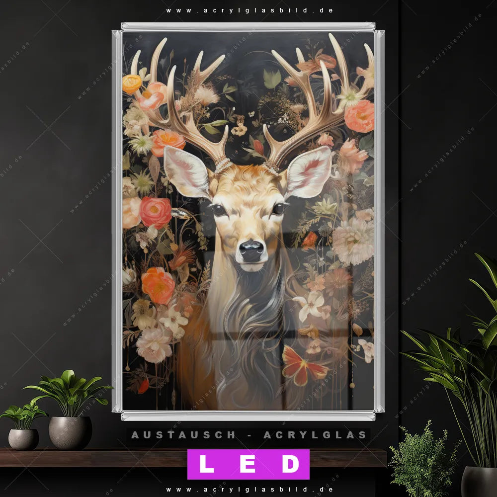 Begriffe wie Rotwild, Wald, Hirsch, Blüten, Geweih haben dich auf der Suche nach deinem neuen Austausch-Acrylglasbild inspiriert? Dann sollte das Wechsel-Acrylglasbild Hirsch in blühender Pracht für dein bereits vorhandenes LED Acrylglasbild Canvalight® DIA den Weg zu dir finden.