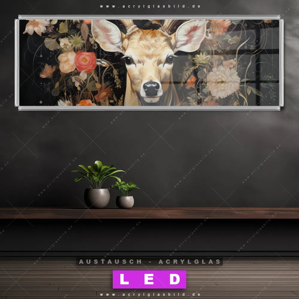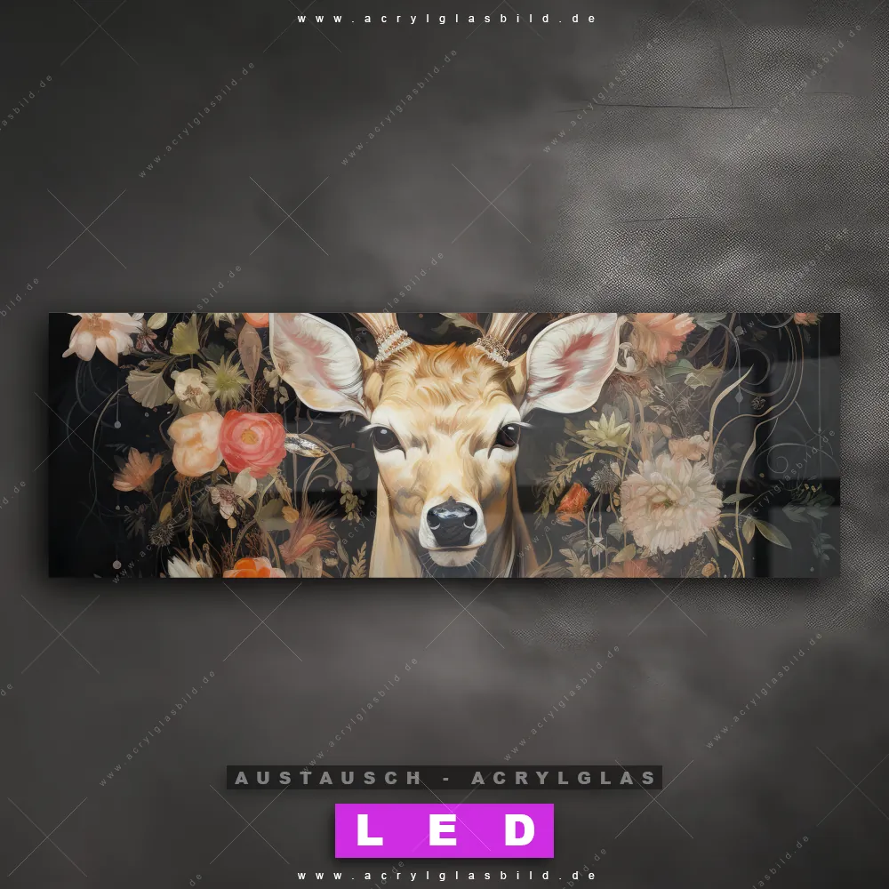 Begriffe wie Rotwild, Wald, Hirsch, Blüten, Geweih haben dich auf der Suche nach deinem neuen Austausch-Acrylglasbild inspiriert? Dann sollte das Wechsel-Acrylglasbild Hirsch in blühender Pracht für dein bereits vorhandenes LED Acrylglasbild Canvalight® DIA den Weg zu dir finden.