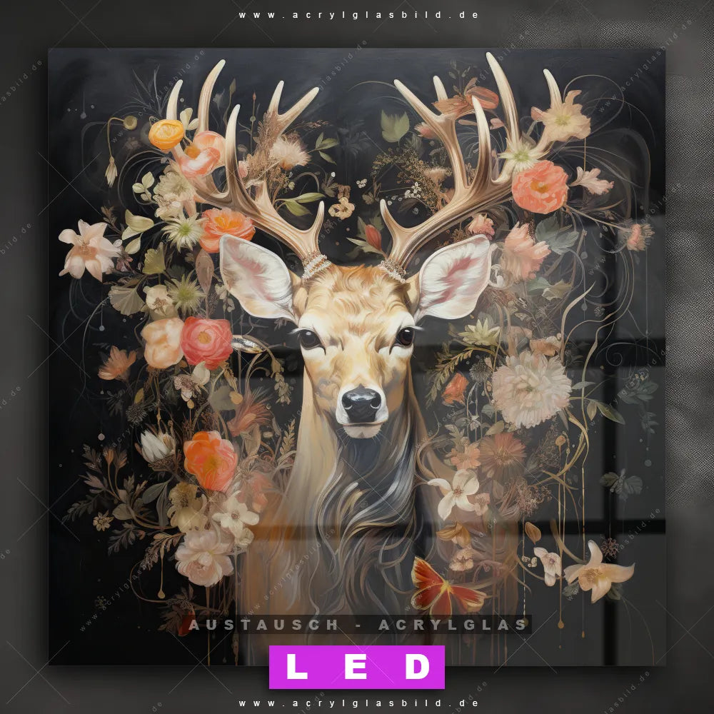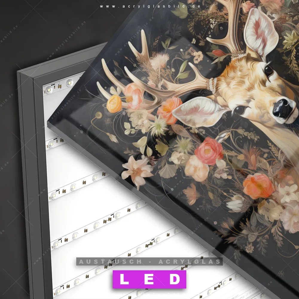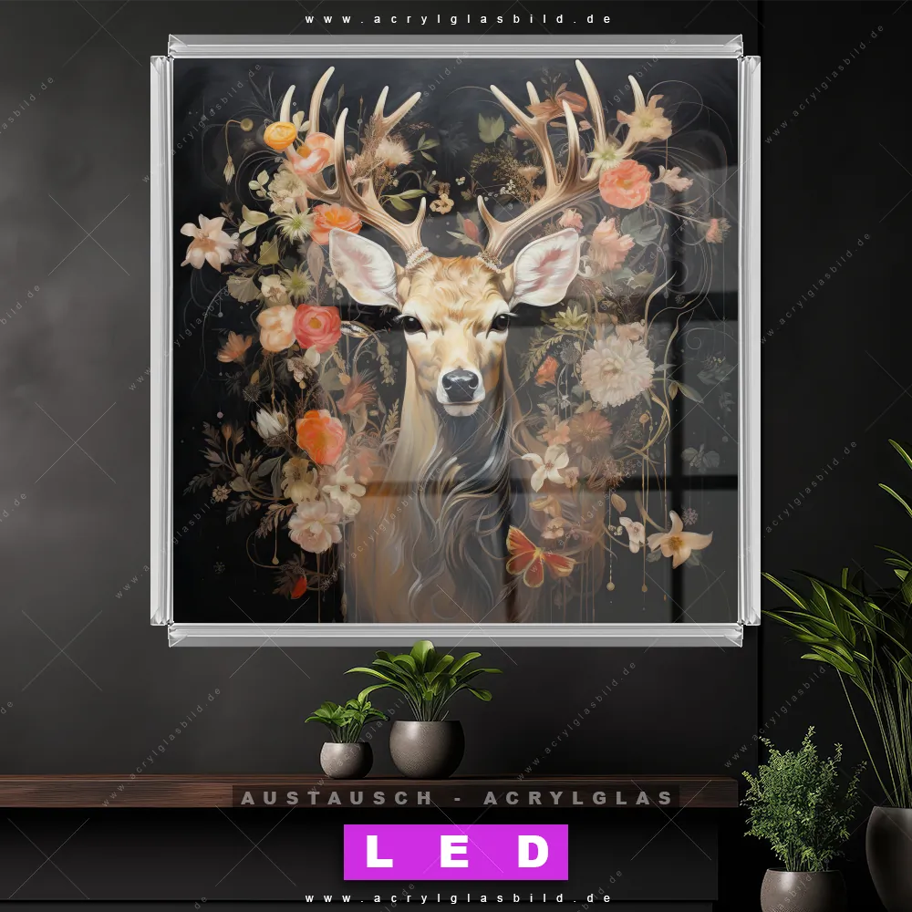 Begriffe wie Rotwild, Wald, Hirsch, Blüten, Geweih haben dich auf der Suche nach deinem neuen Austausch-Acrylglasbild inspiriert? Dann sollte das Wechsel-Acrylglasbild Hirsch in blühender Pracht für dein bereits vorhandenes LED Acrylglasbild Canvalight® DIA den Weg zu dir finden.