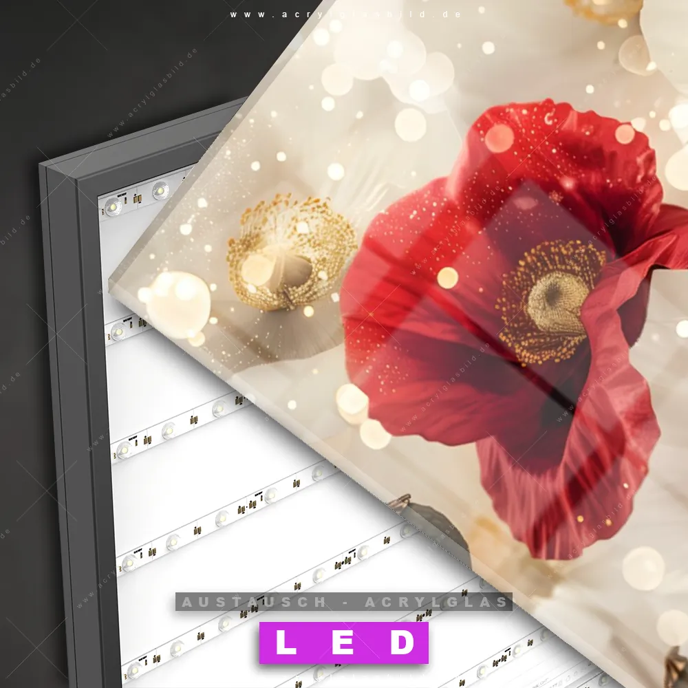 Begriffe wie Pflanze, Natur, Blüten, Mohnblumen, Blumenwiese, Glitzer, Blütenmeer, Klatschmohn haben dich auf der Suche nach deinem neuen Austausch-Acrylglasbild inspiriert? Dann sollte das Wechsel-Acrylglasbild Leuchtende Blütenpracht für dein bereits vorhandenes LED Acrylglasbild Canvalight® DIA den Weg zu dir finden.