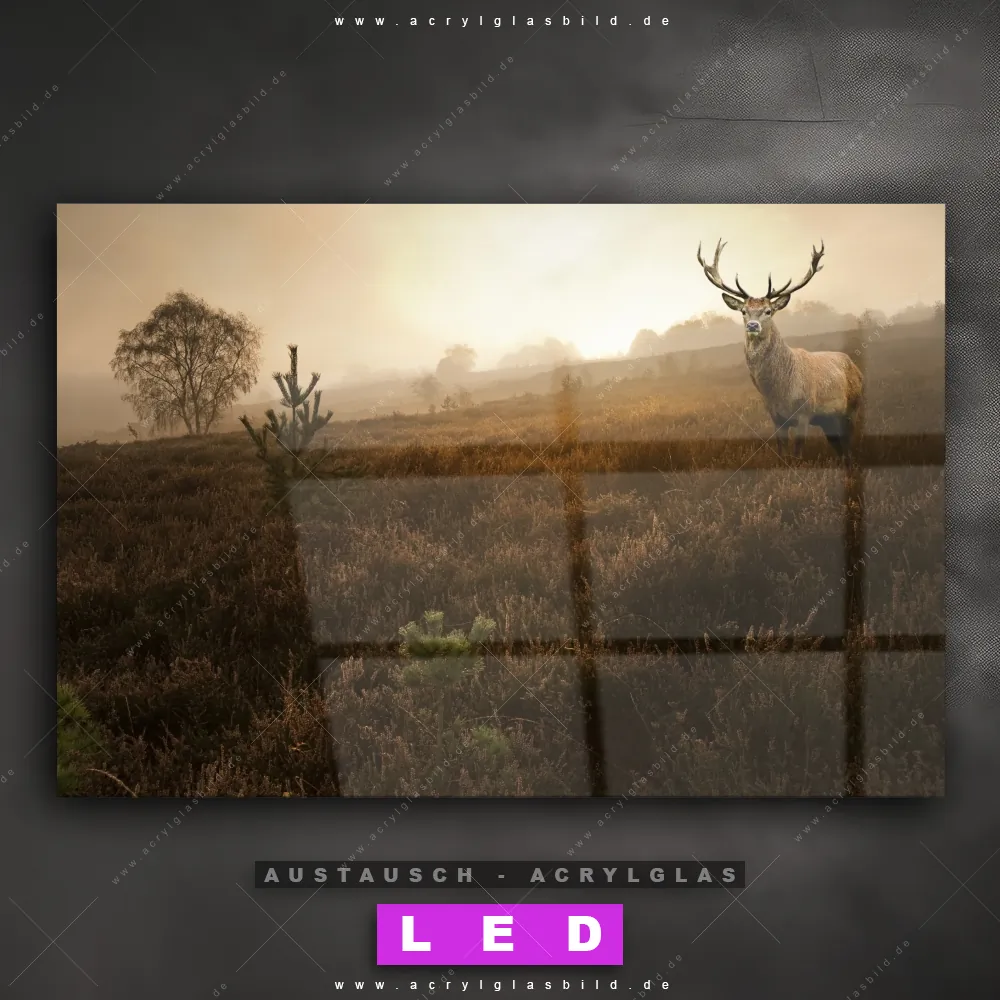 Begriffe wie Nebel, Natur, Hirsch, Deer, Wild, Rotwild, Wiese, Weide, Feld, Wald haben dich auf der Suche nach deinem neuen Austausch-Acrylglasbild inspiriert? Dann sollte das Wechsel-Acrylglasbild Hirsch im Morgennebel für dein bereits vorhandenes LED Acrylglasbild Canvalight® DIA den Weg zu dir finden.