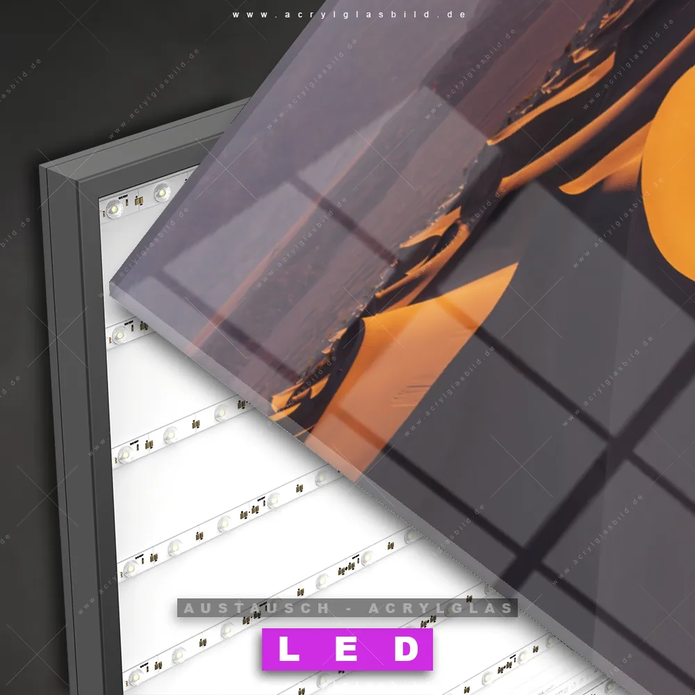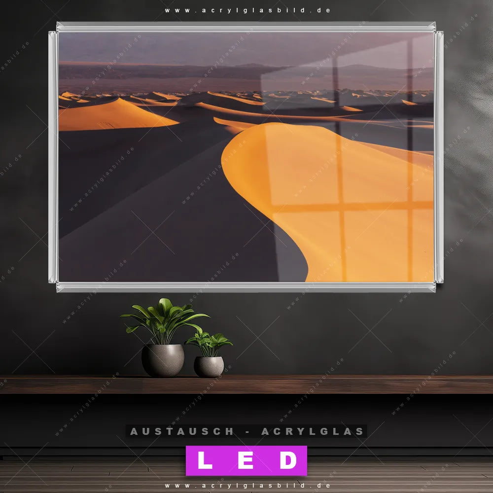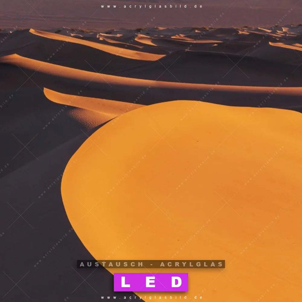Begriffe wie Sonnenuntergang, Sonnenaufgang, Sand, Landschaft, Urlaub, Reisen, Wüste, Düne haben dich auf der Suche nach deinem neuen Austausch-Acrylglasbild inspiriert? Dann sollte das Wechsel-Acrylglasbild Wüste für dein bereits vorhandenes LED Acrylglasbild Canvalight® DIA den Weg zu dir finden.
