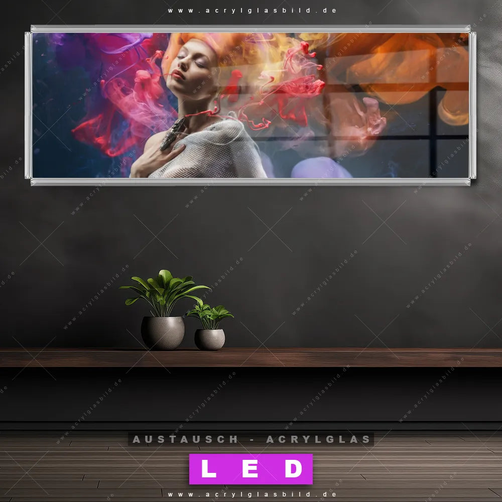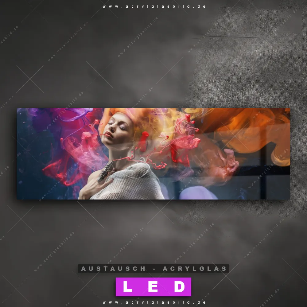 Begriffe wie Flüssigkeit, Acryl, flüssig, Farbe, Tinte, Alkohol, Wasser, Fantasie, Meerjungfrau, Unterwasser, Wasserfarbe haben dich auf der Suche nach deinem neuen Austausch-Acrylglasbild inspiriert? Dann sollte das Wechsel-Acrylglasbild Nixe im Farbnebel für dein bereits vorhandenes LED Acrylglasbild Canvalight® DIA den Weg zu dir finden.
