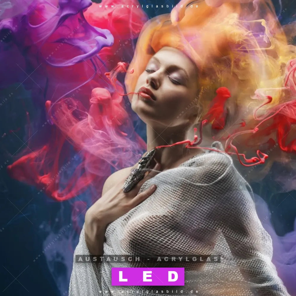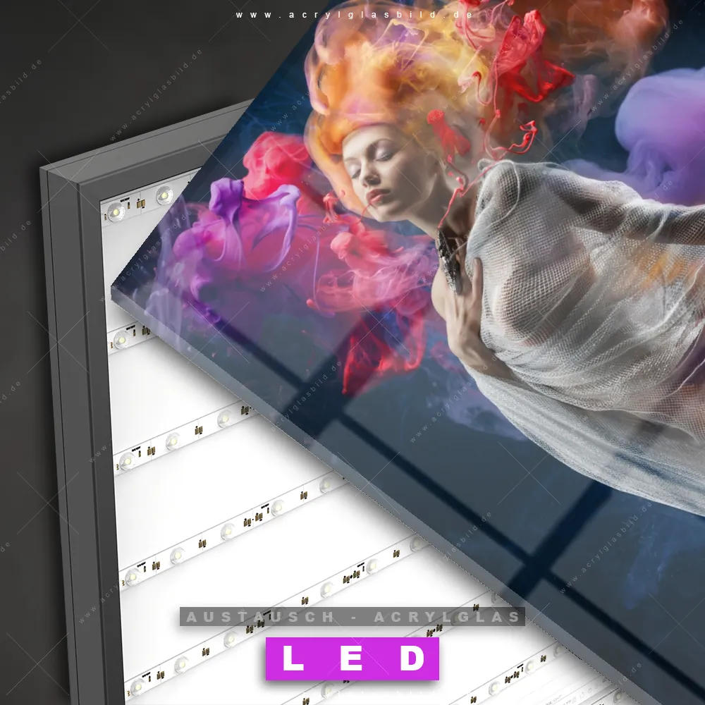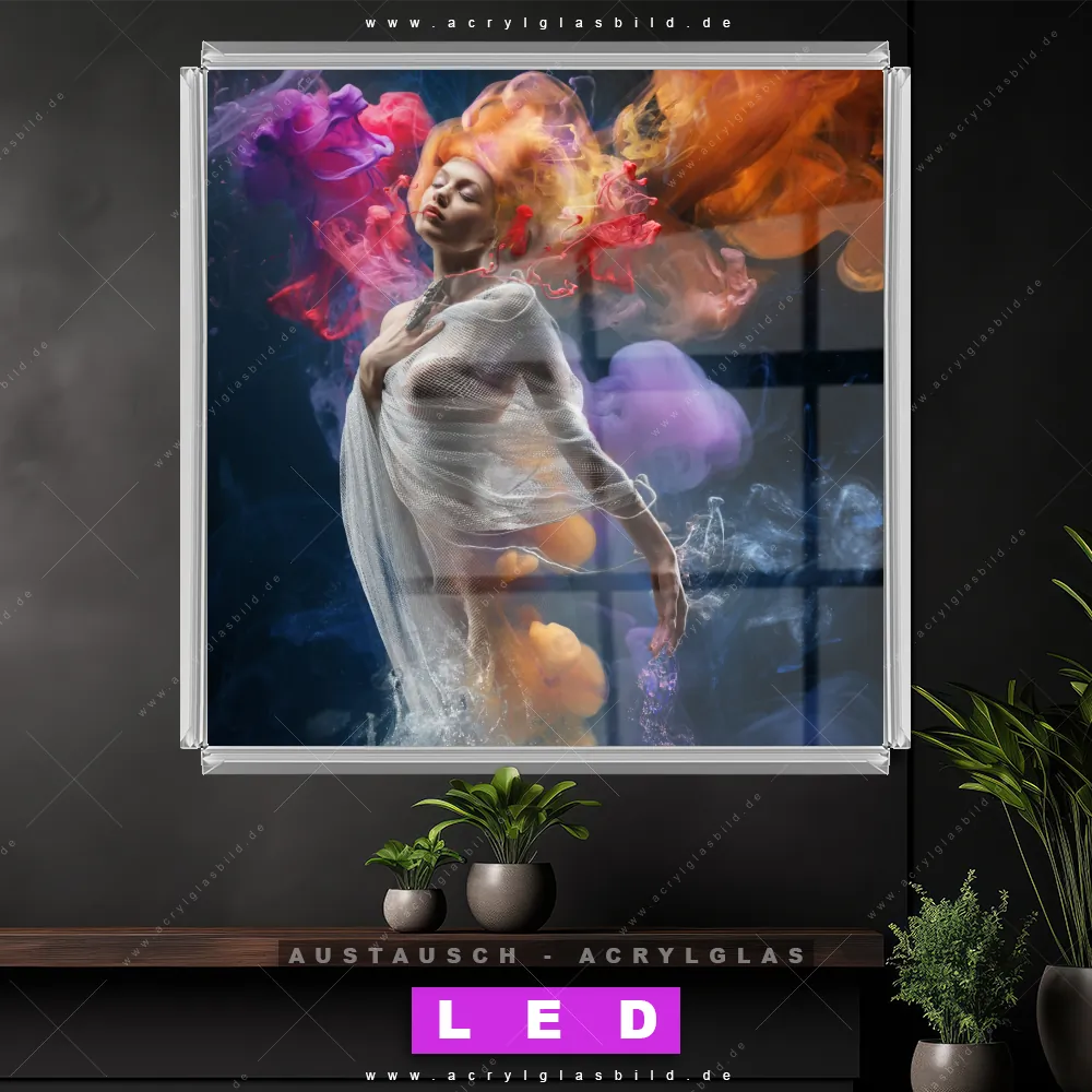 Begriffe wie Flüssigkeit, Acryl, flüssig, Farbe, Tinte, Alkohol, Wasser, Fantasie, Meerjungfrau, Unterwasser, Wasserfarbe haben dich auf der Suche nach deinem neuen Austausch-Acrylglasbild inspiriert? Dann sollte das Wechsel-Acrylglasbild Nixe im Farbnebel für dein bereits vorhandenes LED Acrylglasbild Canvalight® DIA den Weg zu dir finden.