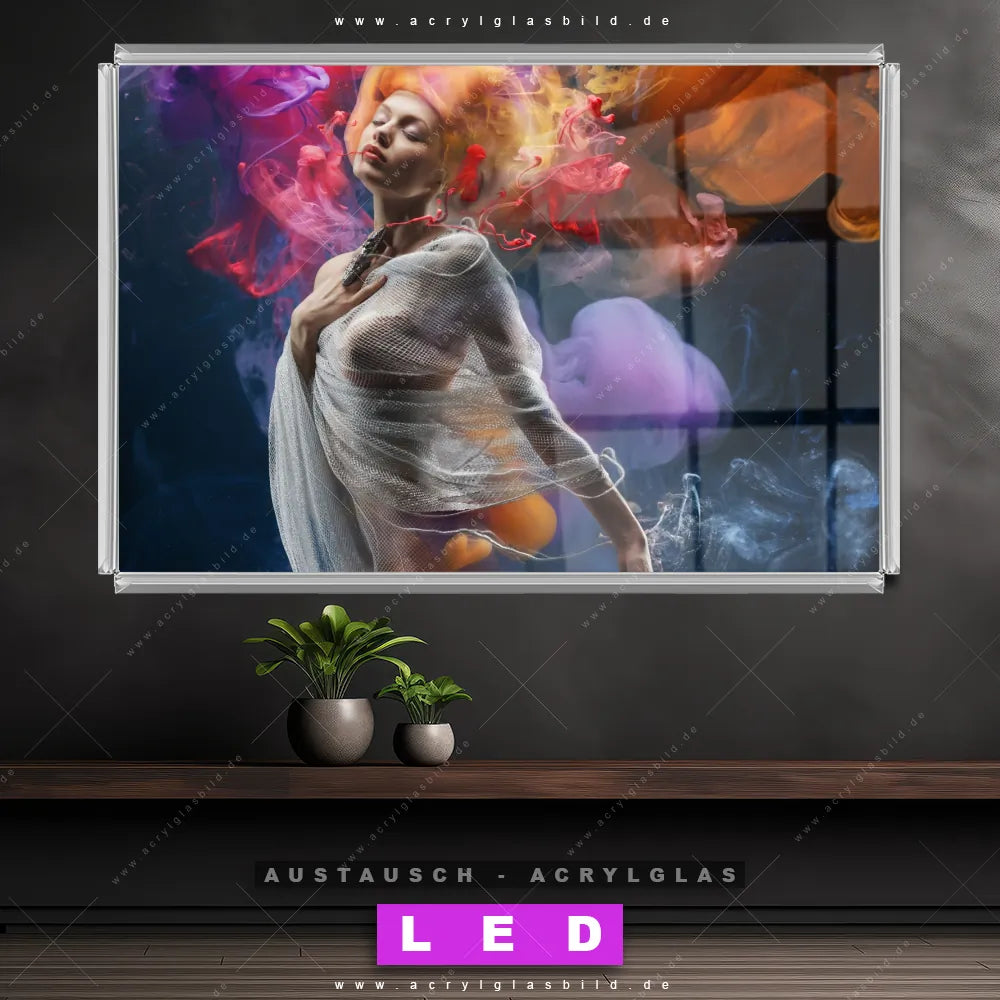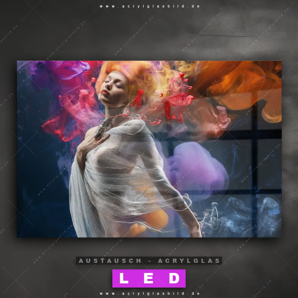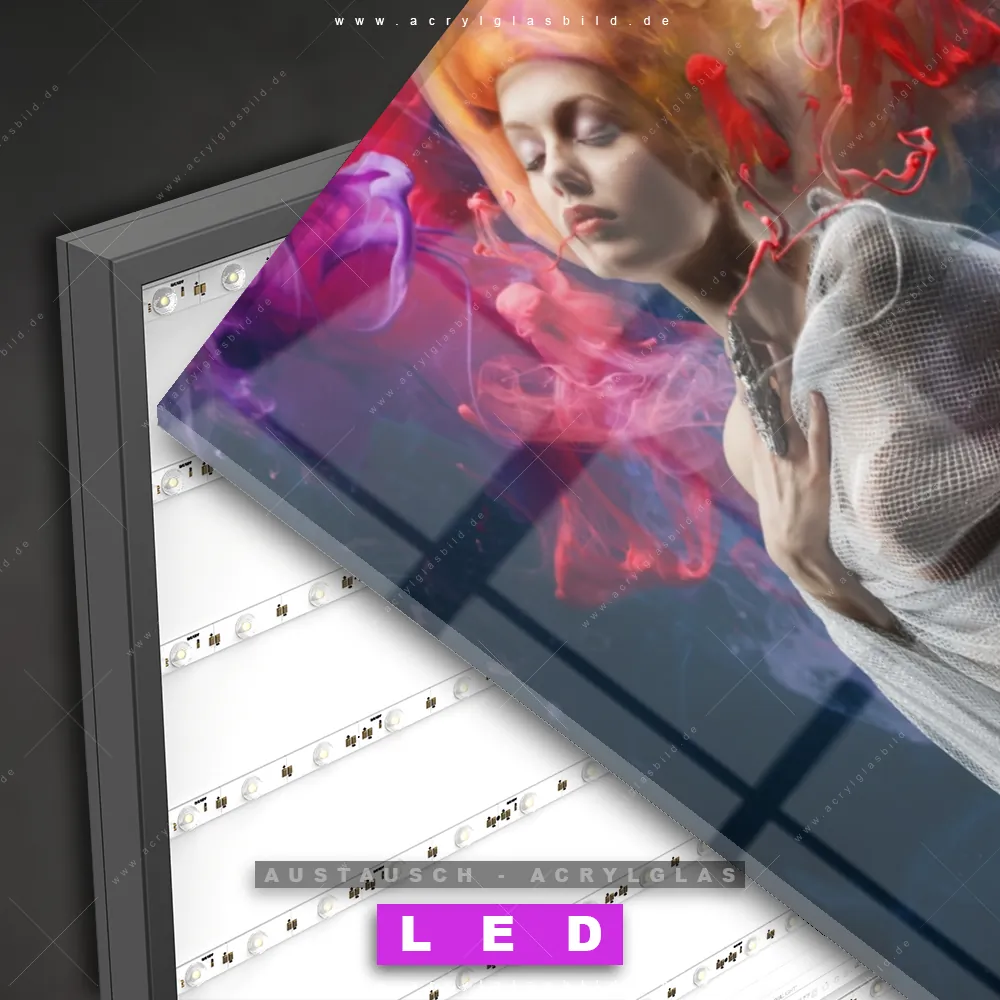 Begriffe wie Flüssigkeit, Acryl, flüssig, Farbe, Tinte, Alkohol, Wasser, Fantasie, Meerjungfrau, Unterwasser, Wasserfarbe haben dich auf der Suche nach deinem neuen Austausch-Acrylglasbild inspiriert? Dann sollte das Wechsel-Acrylglasbild Nixe im Farbnebel für dein bereits vorhandenes LED Acrylglasbild Canvalight® DIA den Weg zu dir finden.
