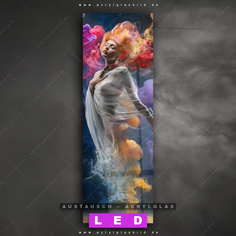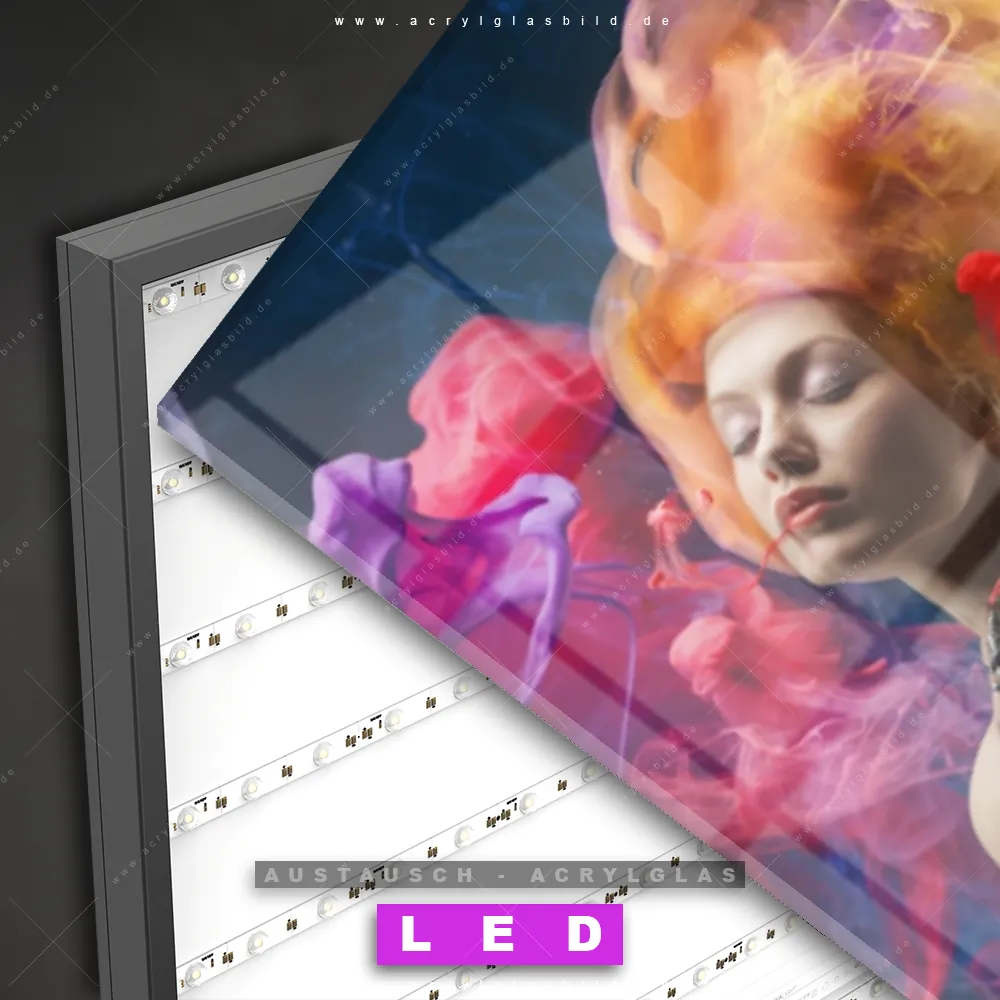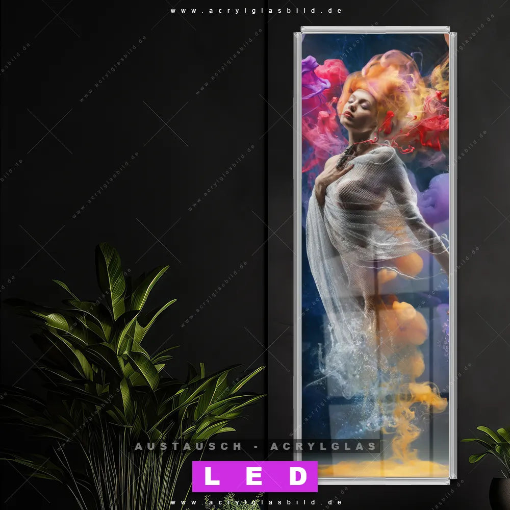 Begriffe wie Flüssigkeit, Acryl, flüssig, Farbe, Tinte, Alkohol, Wasser, Fantasie, Meerjungfrau, Unterwasser, Wasserfarbe haben dich auf der Suche nach deinem neuen Austausch-Acrylglasbild inspiriert? Dann sollte das Wechsel-Acrylglasbild Nixe im Farbnebel für dein bereits vorhandenes LED Acrylglasbild Canvalight® DIA den Weg zu dir finden.