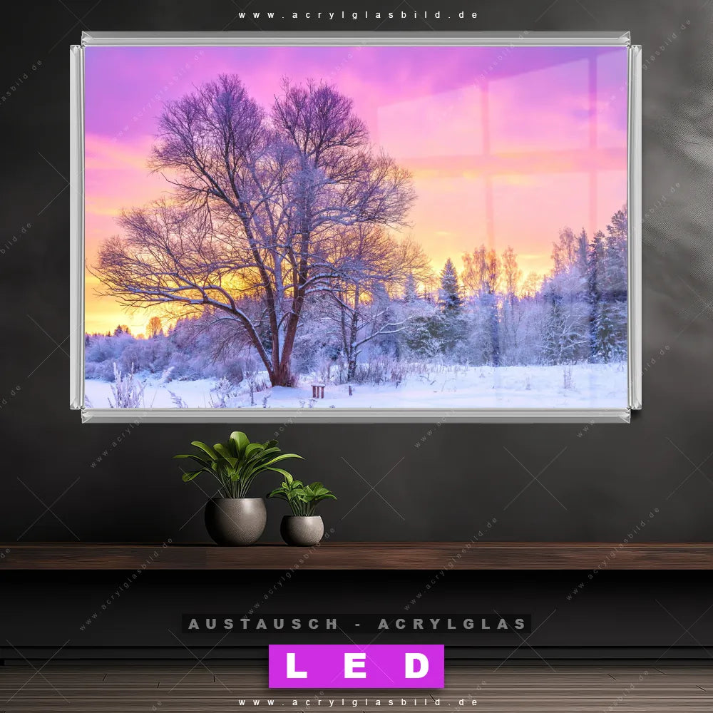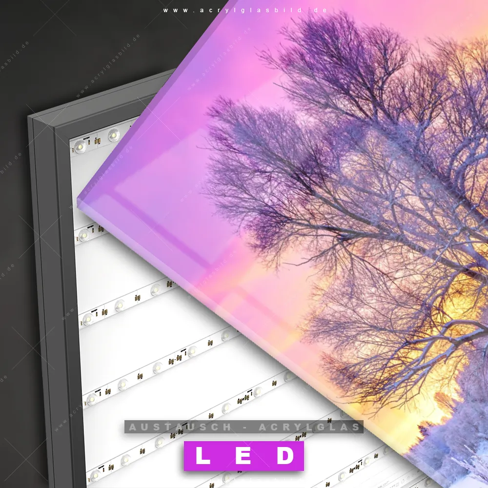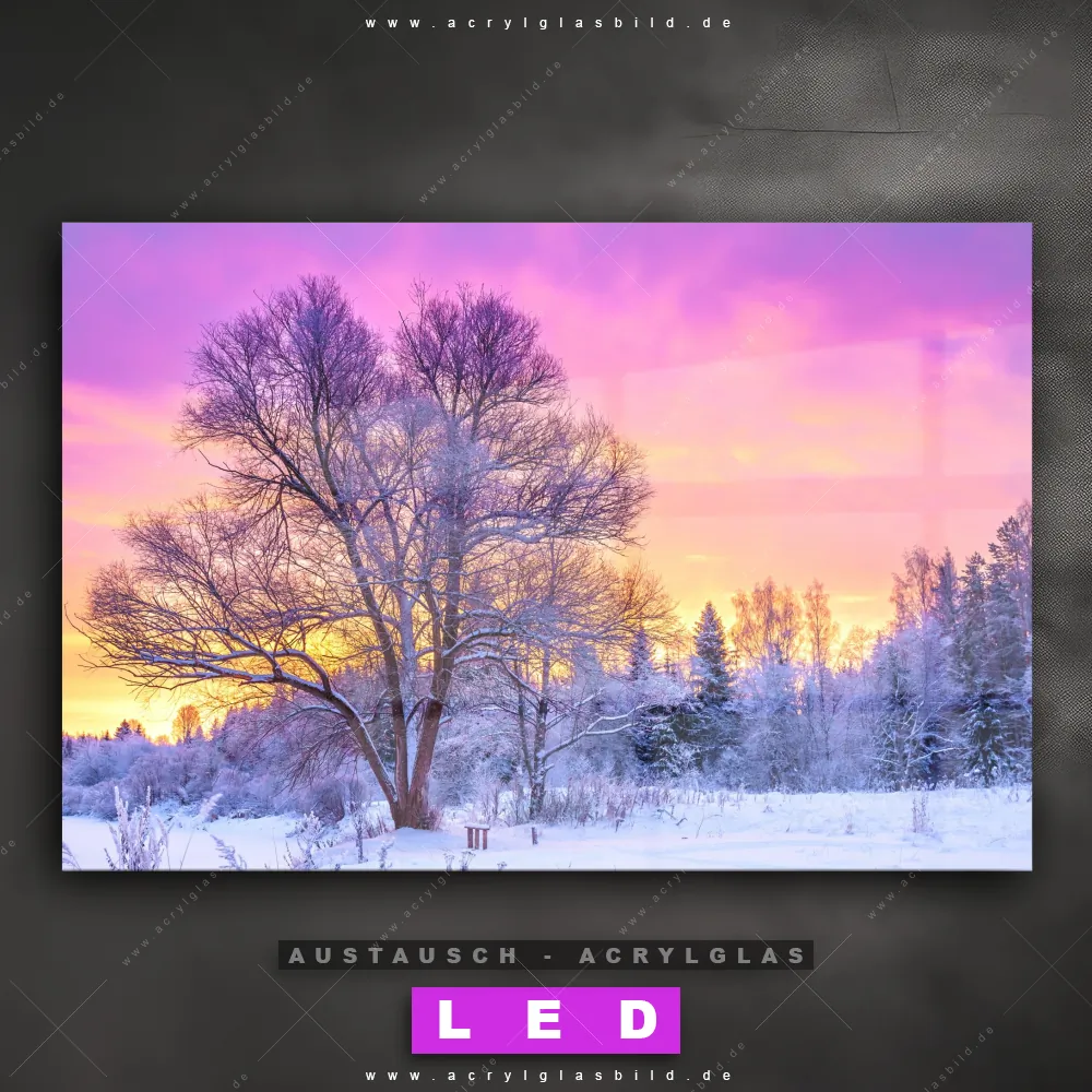Begriffe wie Schneelandschaft, Winter, Schnee, Sonnenaufgang, Weihnachten, Wald haben dich auf der Suche nach deinem neuen Austausch-Acrylglasbild inspiriert? Dann sollte das Wechsel-Acrylglasbild Sonnenuntergang im Winter für dein bereits vorhandenes LED Acrylglasbild Canvalight® DIA den Weg zu dir finden.