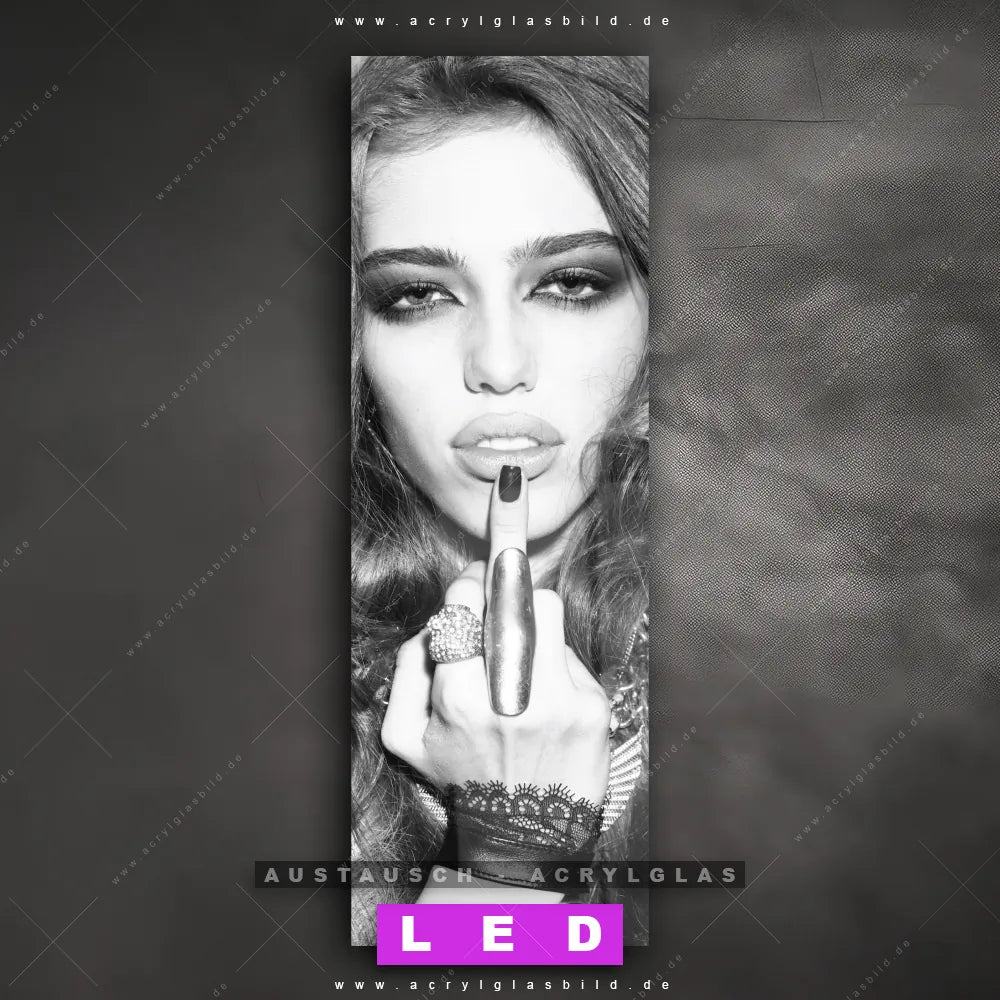 Begriffe wie Frau, Lippen, Mund, Porträt, modern, Beauty, Schönheit, Mädchen, Finger, Mittelfinger, Stinkefinger haben dich auf der Suche nach deinem neuen Austausch-Acrylglasbild inspiriert? Dann sollte das Wechsel-Acrylglasbild Frau zeigt Mittelfinger für dein bereits vorhandenes LED Acrylglasbild Canvalight® DIA den Weg zu dir finden.