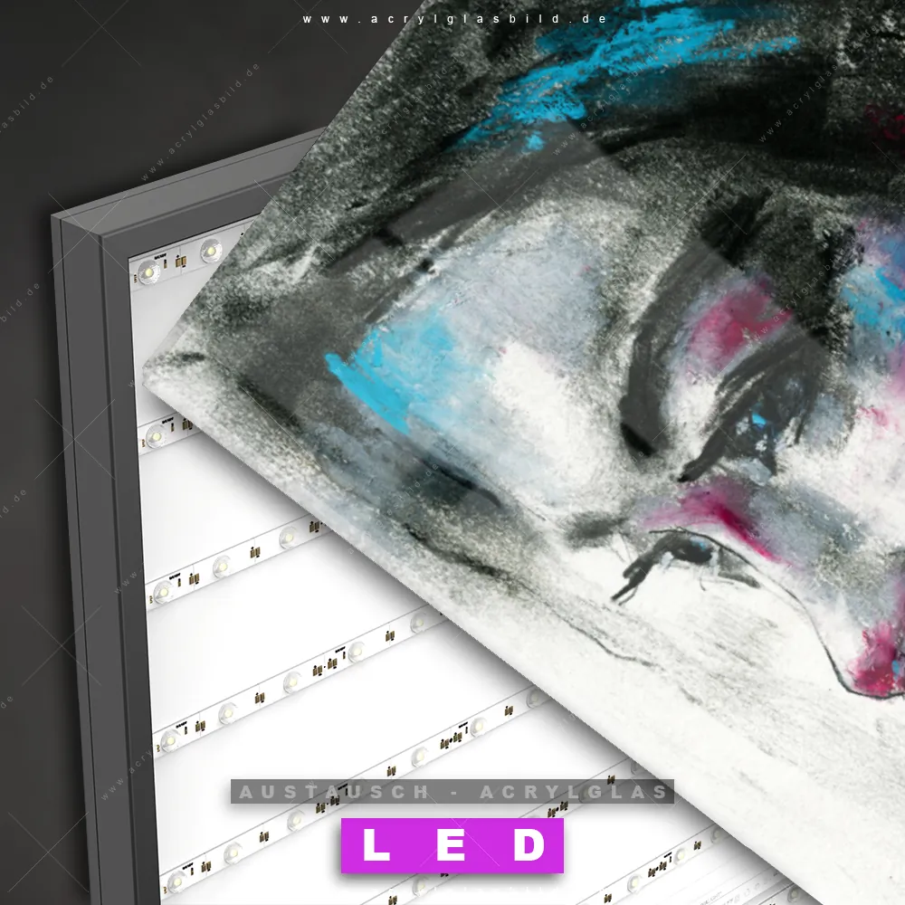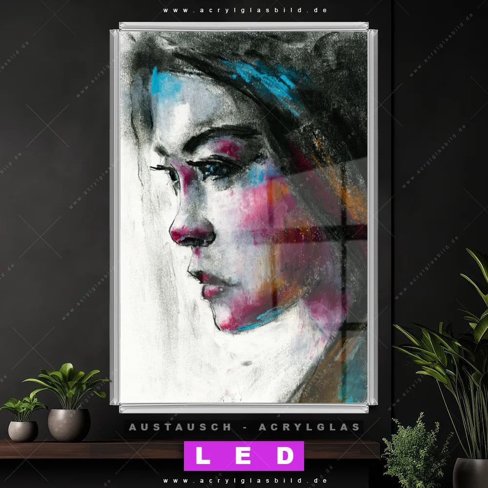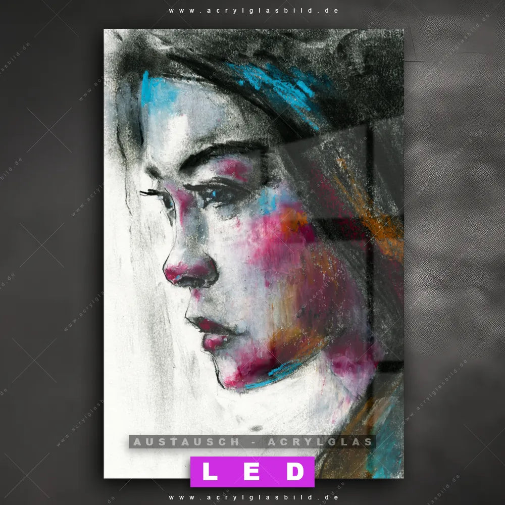 Begriffe wie Abstrakt, Modern, Kunst, Gemälde, Ölfarbe, Leinwand, Frau, Portrait, Geheimnis, schweigen, Lippen haben dich auf der Suche nach deinem neuen Austausch-Acrylglasbild inspiriert? Dann sollte das Wechsel-Acrylglasbild nachdenkliches Mädchen für dein bereits vorhandenes LED Acrylglasbild Canvalight® DIA den Weg zu dir finden.