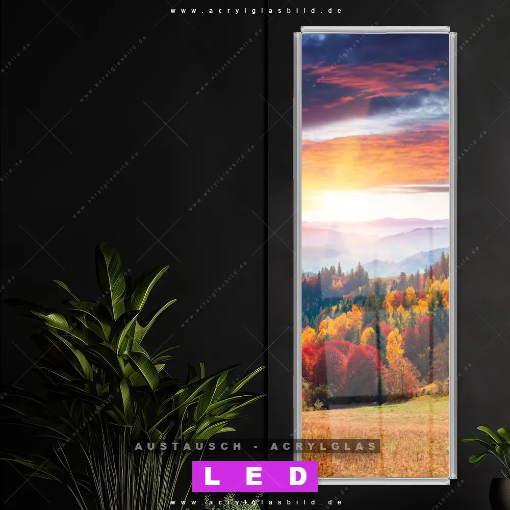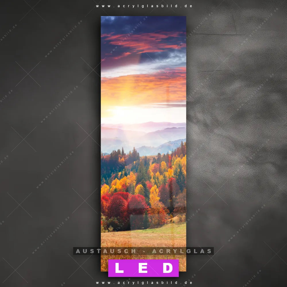 Begriffe wie Wald, Landschaft, Bäume, Natur, Baum, Buche, Ruhe, Stille haben dich auf der Suche nach deinem neuen Austausch-Acrylglasbild inspiriert? Dann sollte das Wechsel-Acrylglasbild Sonnenuntergang im Herbst für dein bereits vorhandenes LED Acrylglasbild Canvalight® DIA den Weg zu dir finden.