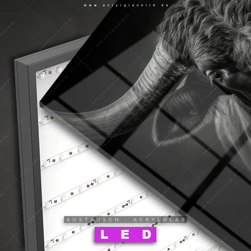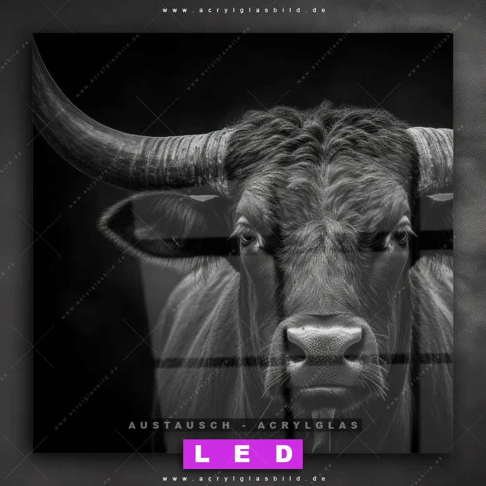 Begriffe wie Hochlandrind, Rind, Stier, Hörner, Porträt haben dich auf der Suche nach deinem neuen Austausch-Acrylglasbild inspiriert? Dann sollte das Wechsel-Acrylglasbild Stier mit Hörnern für dein bereits vorhandenes LED Acrylglasbild Canvalight® DIA den Weg zu dir finden.