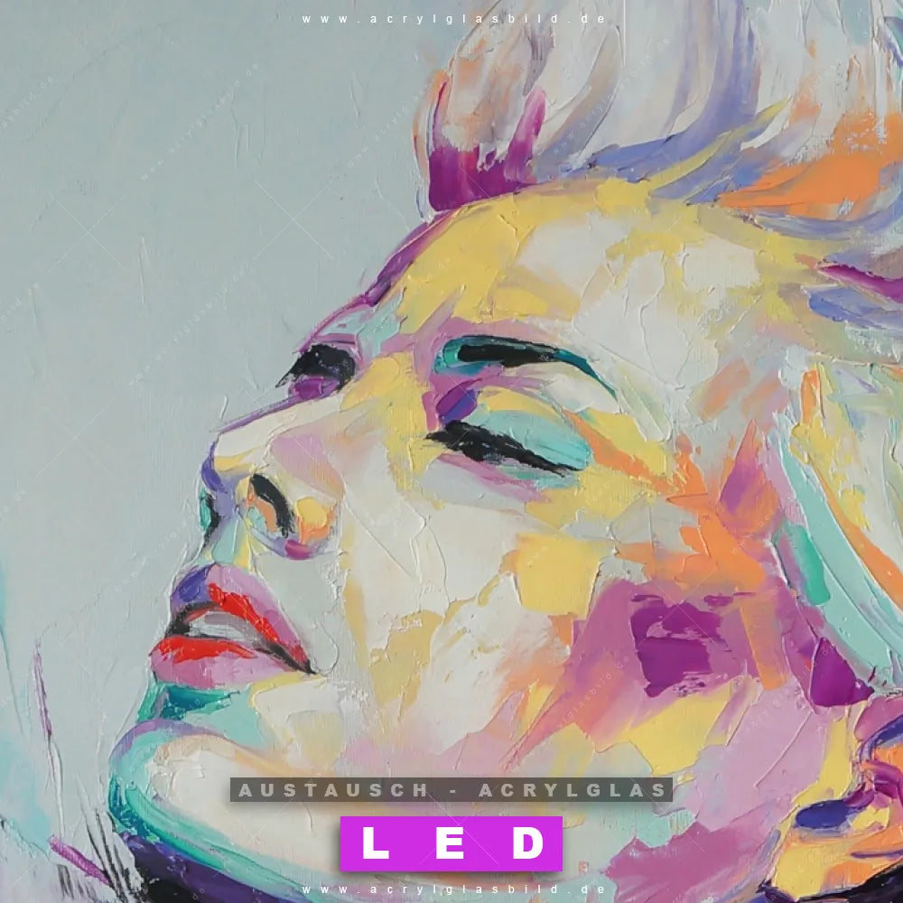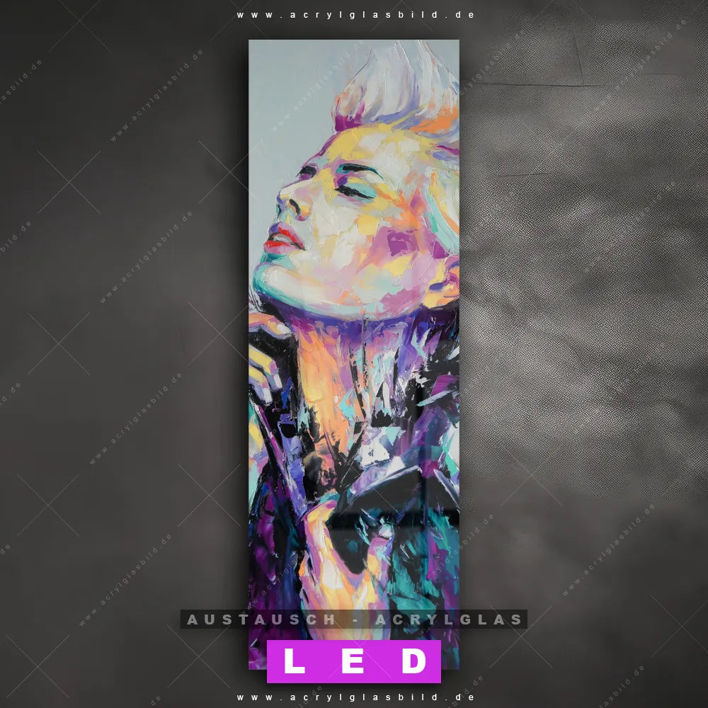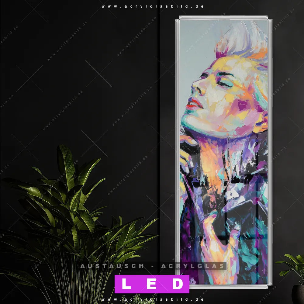 Begriffe wie Abstrakt, Modern, Kunst, Gemälde, Ölfarbe, Leinwand, Frau, Portrait, Gesicht haben dich auf der Suche nach deinem neuen Austausch-Acrylglasbild inspiriert? Dann sollte das Wechsel-Acrylglasbild farbenfrohe Schönheit für dein bereits vorhandenes LED Acrylglasbild Canvalight® DIA den Weg zu dir finden.