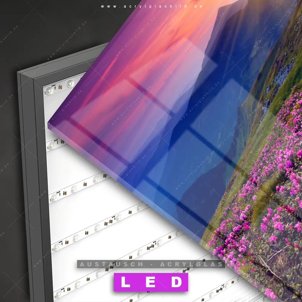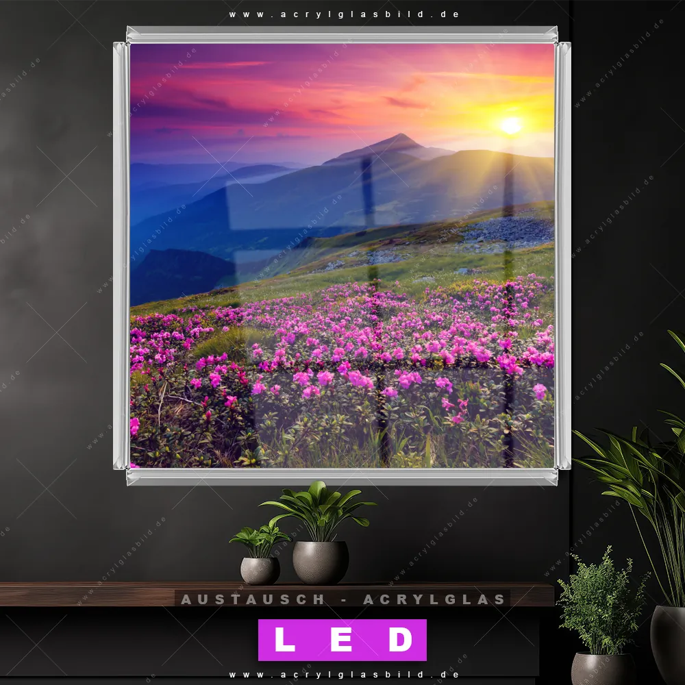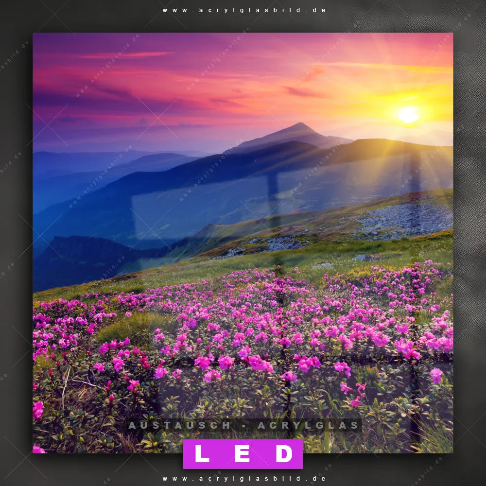 Begriffe wie Berge, Sonnenuntergang, Bergwiese, Sommer, Blumen, Blumenwiese haben dich auf der Suche nach deinem neuen Austausch-Acrylglasbild inspiriert? Dann sollte das Wechsel-Acrylglasbild blühende Wiese in den Bergen für dein bereits vorhandenes LED Acrylglasbild Canvalight® DIA den Weg zu dir finden.