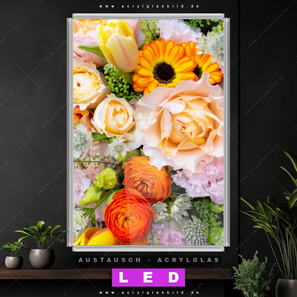 Begriffe wie Pflanze, Nahaufnahme, Blüten, Rosen, Pfingstrosen, Blumenstrauß haben dich auf der Suche nach deinem neuen Austausch-Acrylglasbild inspiriert? Dann sollte das Wechsel-Acrylglasbild Blüten in sommerlichen Farben für dein bereits vorhandenes LED Acrylglasbild Canvalight® DIA den Weg zu dir finden.