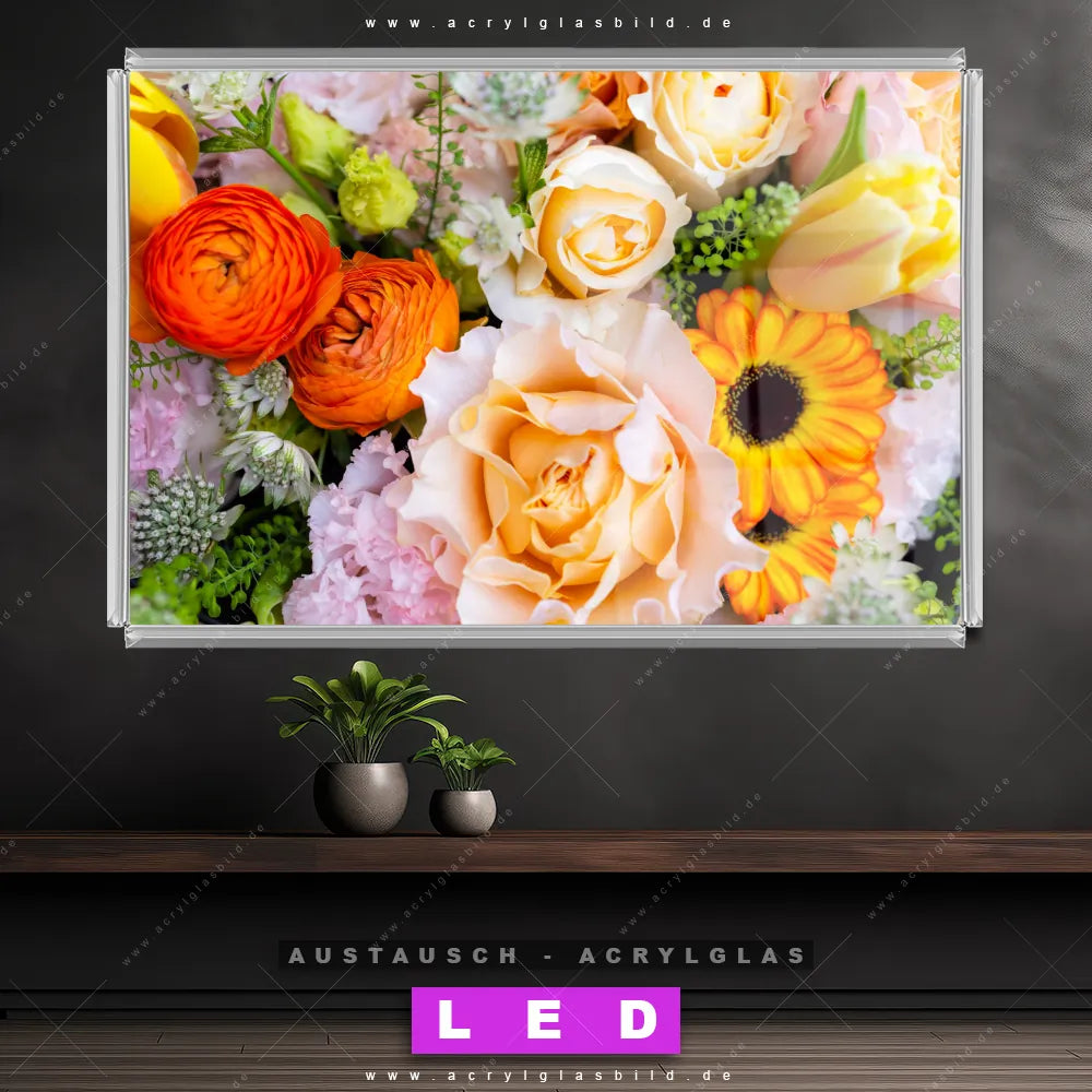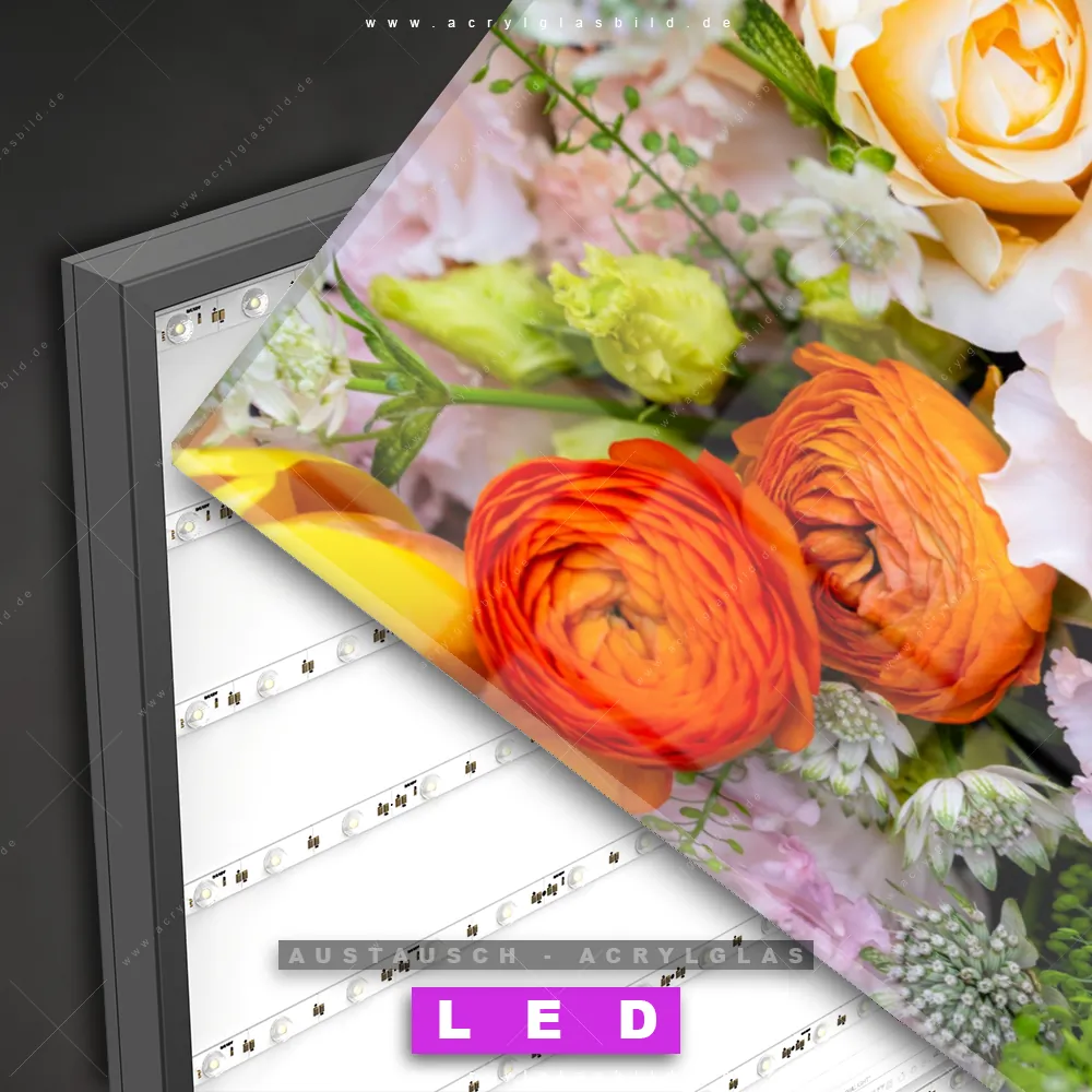 Begriffe wie Pflanze, Nahaufnahme, Blüten, Rosen, Pfingstrosen, Blumenstrauß haben dich auf der Suche nach deinem neuen Austausch-Acrylglasbild inspiriert? Dann sollte das Wechsel-Acrylglasbild Blüten in sommerlichen Farben für dein bereits vorhandenes LED Acrylglasbild Canvalight® DIA den Weg zu dir finden.
