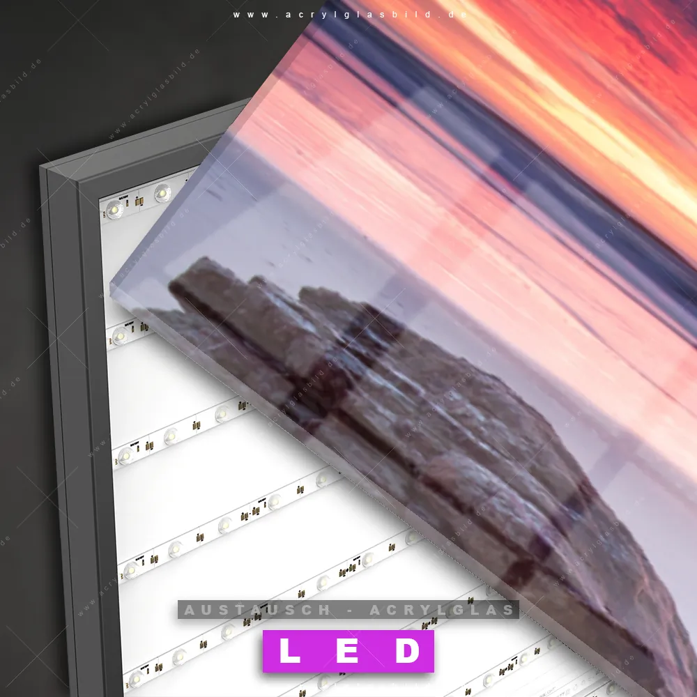 Begriffe wie Felsen, Sommer, Sonnenuntergang - Sonnenaufgang, Ostsee - Nordsee, Deutschland, Urlaub - Reisen, Steine haben dich auf der Suche nach deinem neuen Austausch-Acrylglasbild inspiriert? Dann sollte das Wechsel-Acrylglasbild Sonnenaufgang am Strand für dein bereits vorhandenes LED Acrylglasbild Canvalight® DIA den Weg zu dir finden.