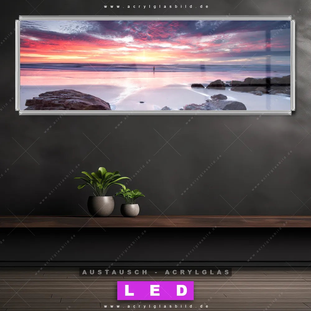 Wechsel-Acrylglas Canvalight® DIA | Sonnenaufgang am Strand mit Felsen | Panorama