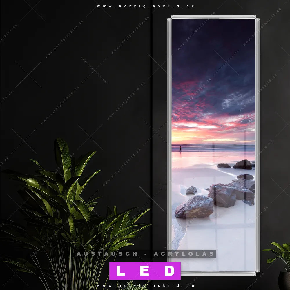 Begriffe wie Felsen, Sommer, Sonnenuntergang - Sonnenaufgang, Ostsee - Nordsee, Deutschland, Urlaub - Reisen, Steine haben dich auf der Suche nach deinem neuen Austausch-Acrylglasbild inspiriert? Dann sollte das Wechsel-Acrylglasbild Sonnenaufgang am Strand für dein bereits vorhandenes LED Acrylglasbild Canvalight® DIA den Weg zu dir finden.