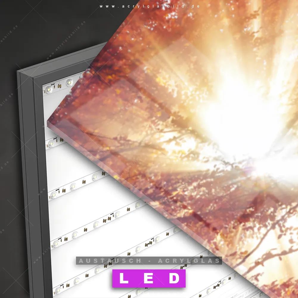 Begriffe wie Wald, Landschaft, Baum, Bäume, Natur, Sonne, Sonnenstrahlen, Licht, Sonnenlicht, Laubwald, Nebel, Dunst, Herbst, Laub haben dich auf der Suche nach deinem neuen Austausch-Acrylglasbild inspiriert? Dann sollte das Wechsel-Acrylglasbild Sonnenstrahlen im Herbstwald für dein bereits vorhandenes LED Acrylglasbild Canvalight® DIA den Weg zu dir finden.