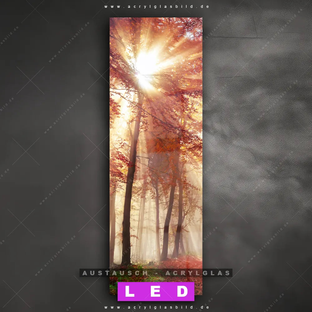 Wechsel-Acrylglas Canvalight® DIA | Sonnenlicht im nebligen Wald | Schmal