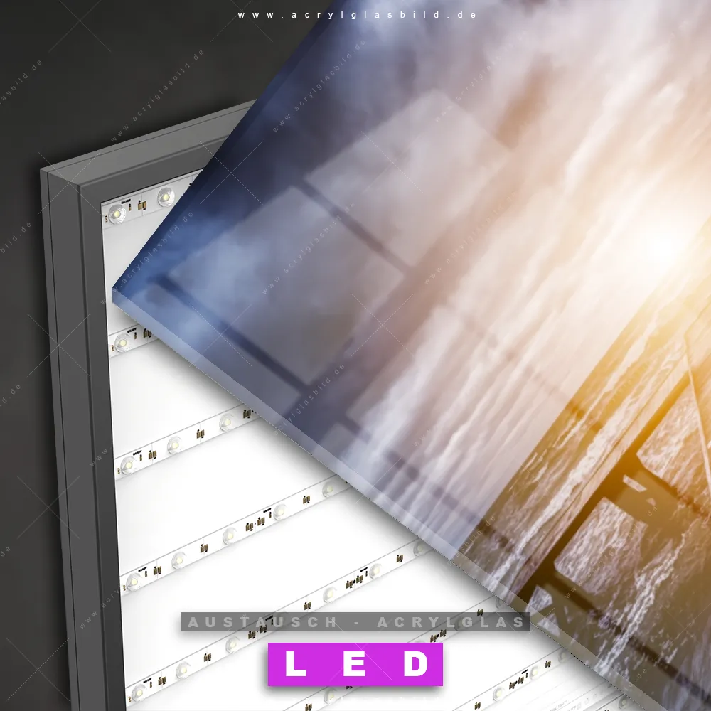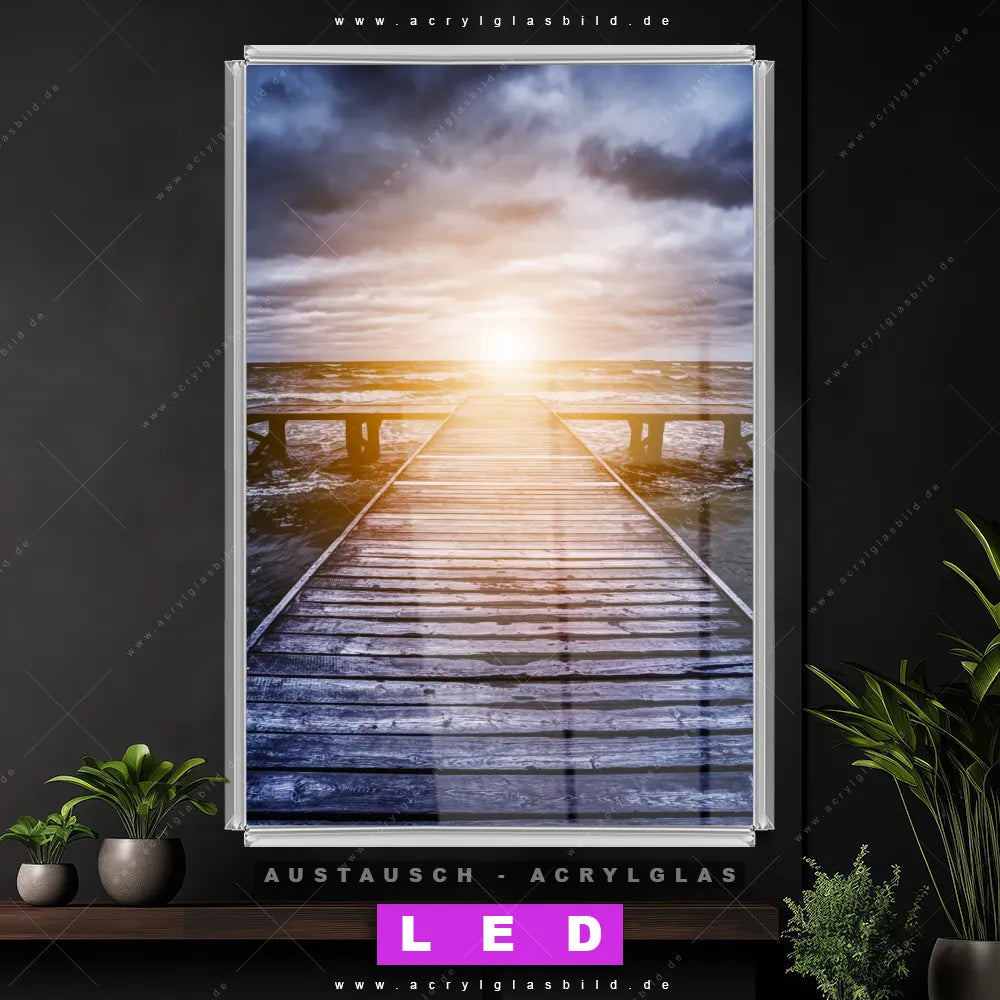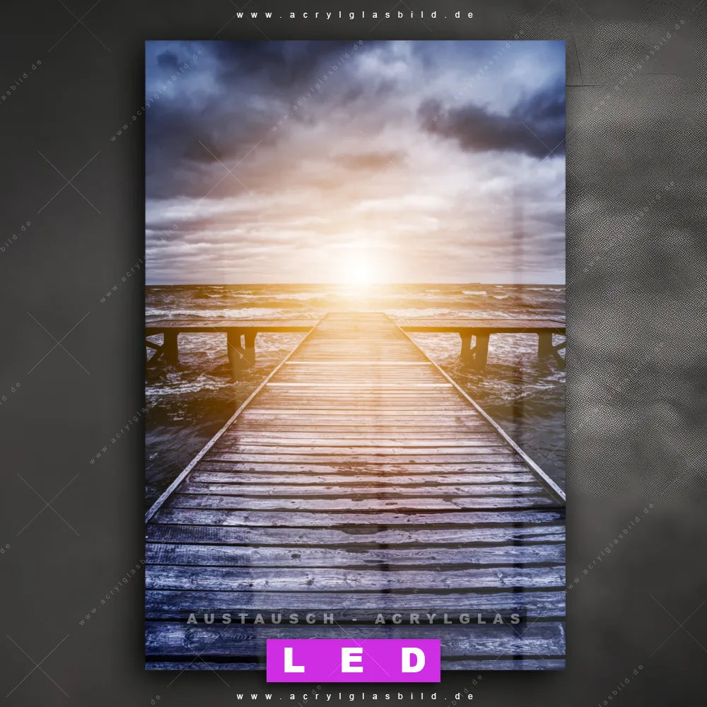 Begriffe wie Küste, Steg, Weg, Herbst, Sonnenuntergang - Sonnenaufgang, Urlaub - Reisen, Deutschland, Pier, Sommer, Ostsee - Nordsee haben dich auf der Suche nach deinem neuen Austausch-Acrylglasbild inspiriert? Dann sollte das Wechsel-Acrylglasbild Steg am rauschenden Meer für dein bereits vorhandenes LED Acrylglasbild Canvalight® DIA den Weg zu dir finden.