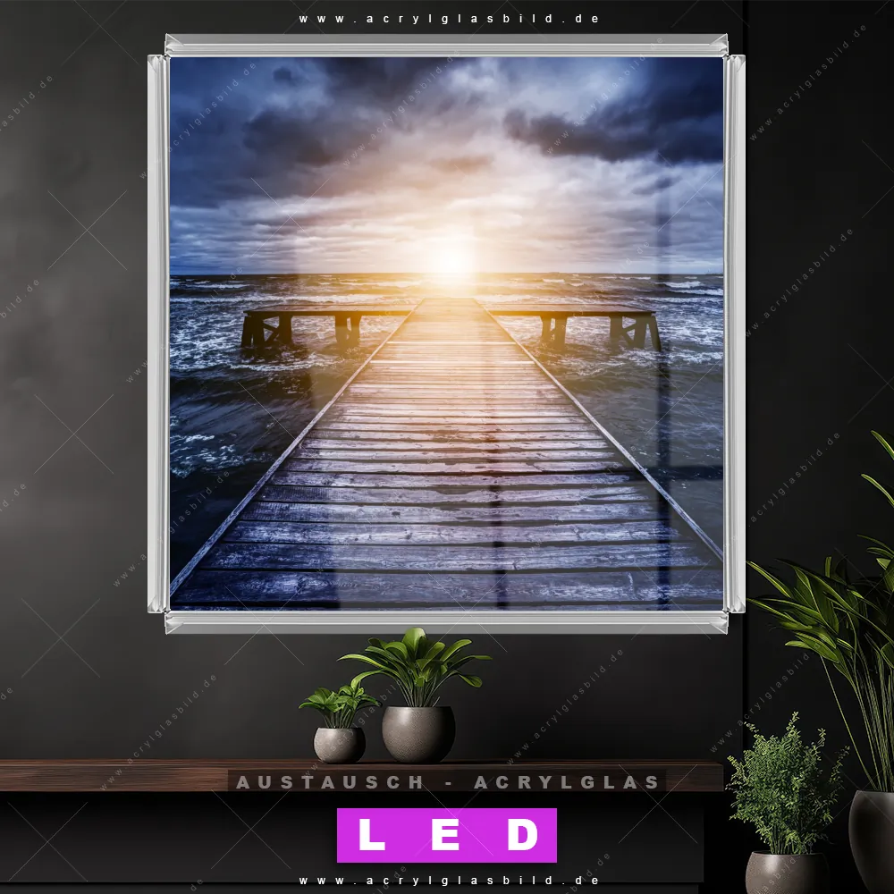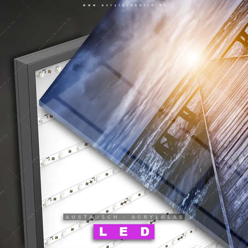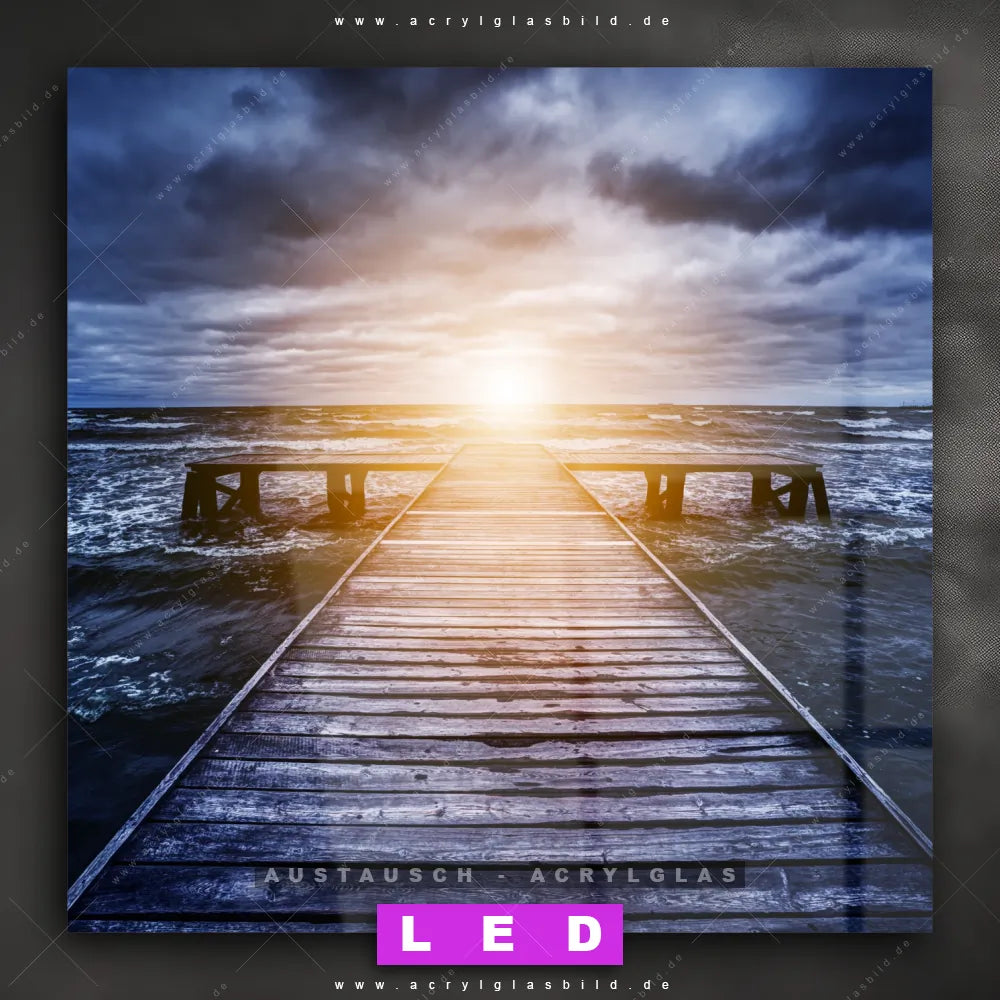 Begriffe wie Küste, Steg, Weg, Herbst, Sonnenuntergang - Sonnenaufgang, Urlaub - Reisen, Deutschland, Pier, Sommer, Ostsee - Nordsee haben dich auf der Suche nach deinem neuen Austausch-Acrylglasbild inspiriert? Dann sollte das Wechsel-Acrylglasbild Steg am rauschenden Meer für dein bereits vorhandenes LED Acrylglasbild Canvalight® DIA den Weg zu dir finden.