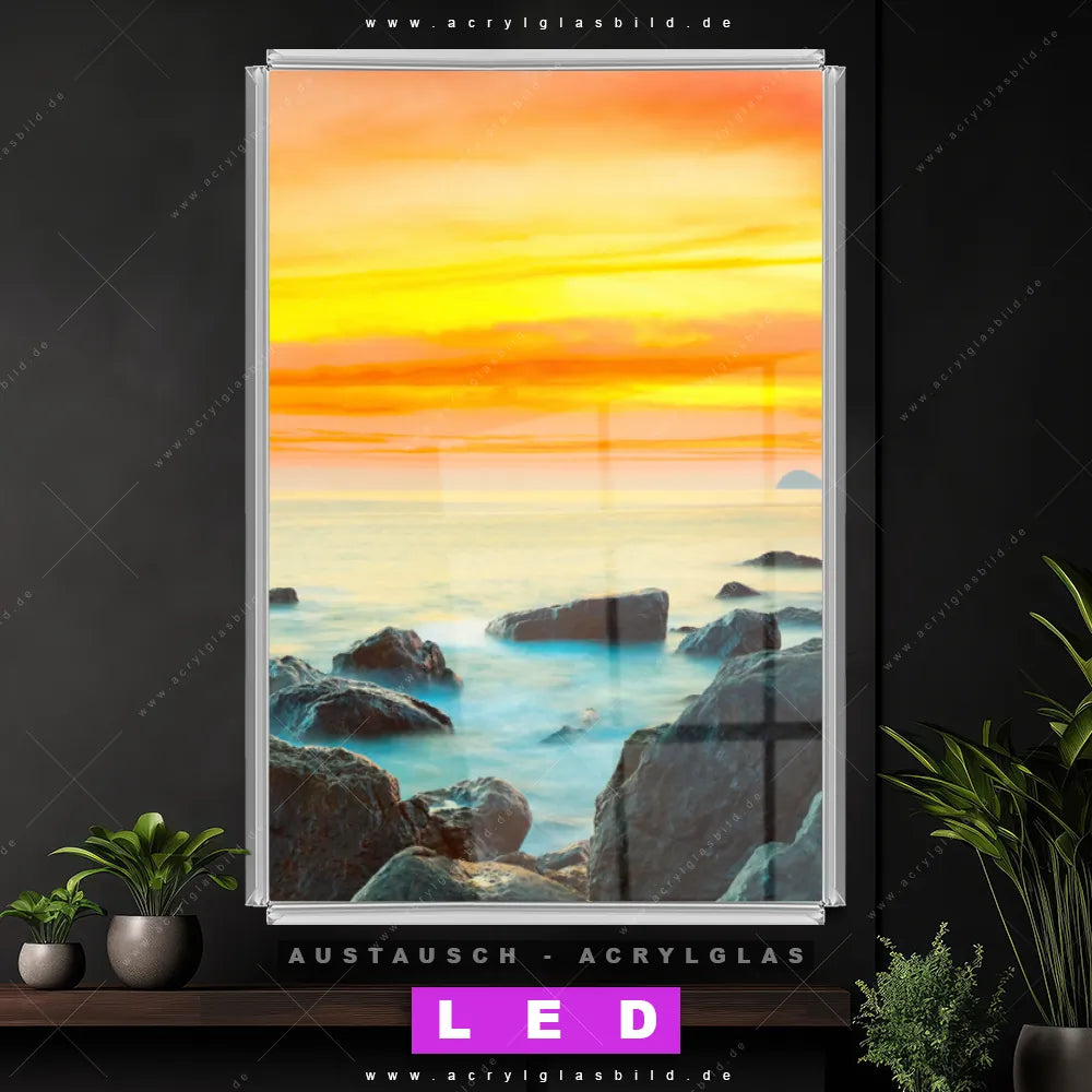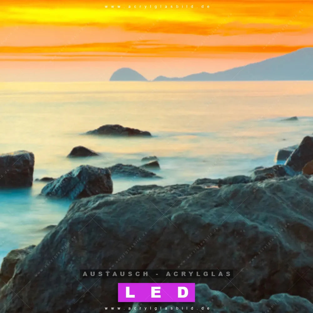 Begriffe wie Küste, Felsen, Sonnenuntergang - Sonnenaufgang, Ostsee - Nordsee, Urlaub - Reisen, Deutschland haben dich auf der Suche nach deinem neuen Austausch-Acrylglasbild inspiriert? Dann sollte das Wechsel-Acrylglasbild Sonnenuntergang Steinküste für dein bereits vorhandenes LED Acrylglasbild Canvalight® DIA den Weg zu dir finden.