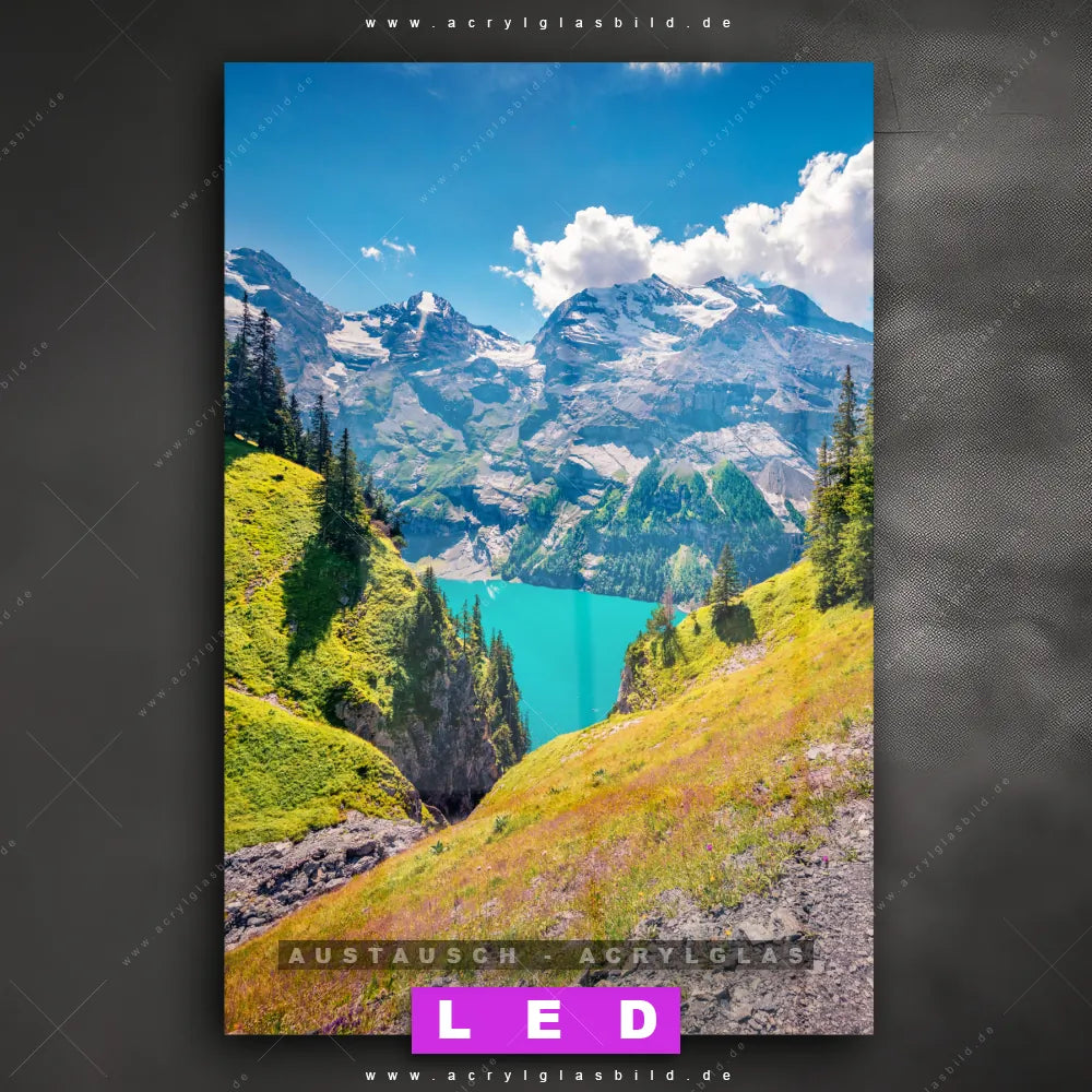 Begriffe wie Natur, Stille, Berge, Gebirge, Bäume, Wald, Gletscher, Felsen, Himmel, Steine, Gletscherspalte, Schlucht, Bergsee, See haben dich auf der Suche nach deinem neuen Austausch-Acrylglasbild inspiriert? Dann sollte das Wechsel-Acrylglasbild See zwischen Bergen für dein bereits vorhandenes LED Acrylglasbild Canvalight® DIA den Weg zu dir finden.