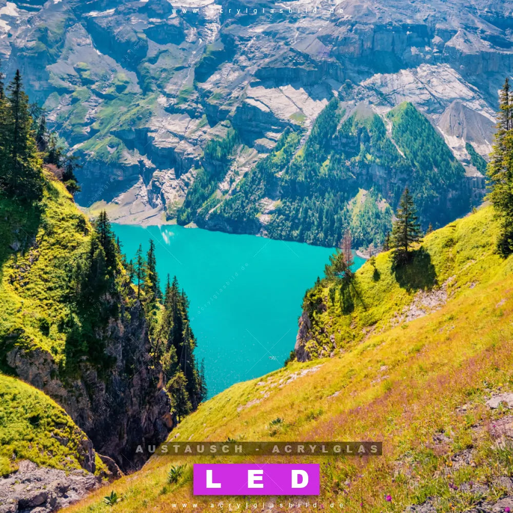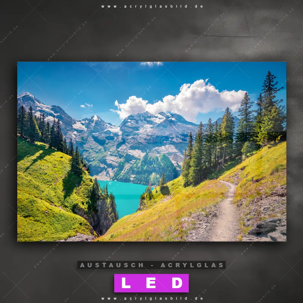 Begriffe wie Natur, Stille, Berge, Gebirge, Bäume, Wald, Gletscher, Felsen, Himmel, Steine, Gletscherspalte, Schlucht, Bergsee, See haben dich auf der Suche nach deinem neuen Austausch-Acrylglasbild inspiriert? Dann sollte das Wechsel-Acrylglasbild See zwischen Bergen für dein bereits vorhandenes LED Acrylglasbild Canvalight® DIA den Weg zu dir finden.