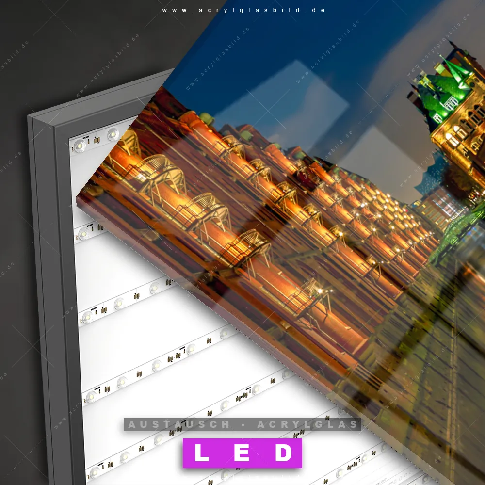 Begriffe wie Stadt, Skyline, Himmel, Hafenstadt, Hamburg, Speicherstadt, Nacht, Fluss haben dich auf der Suche nach deinem neuen Austausch-Acrylglasbild inspiriert? Dann sollte das Wechsel-Acrylglasbild Hansestadt Hamburg für dein bereits vorhandenes LED Acrylglasbild Canvalight® DIA den Weg zu dir finden.