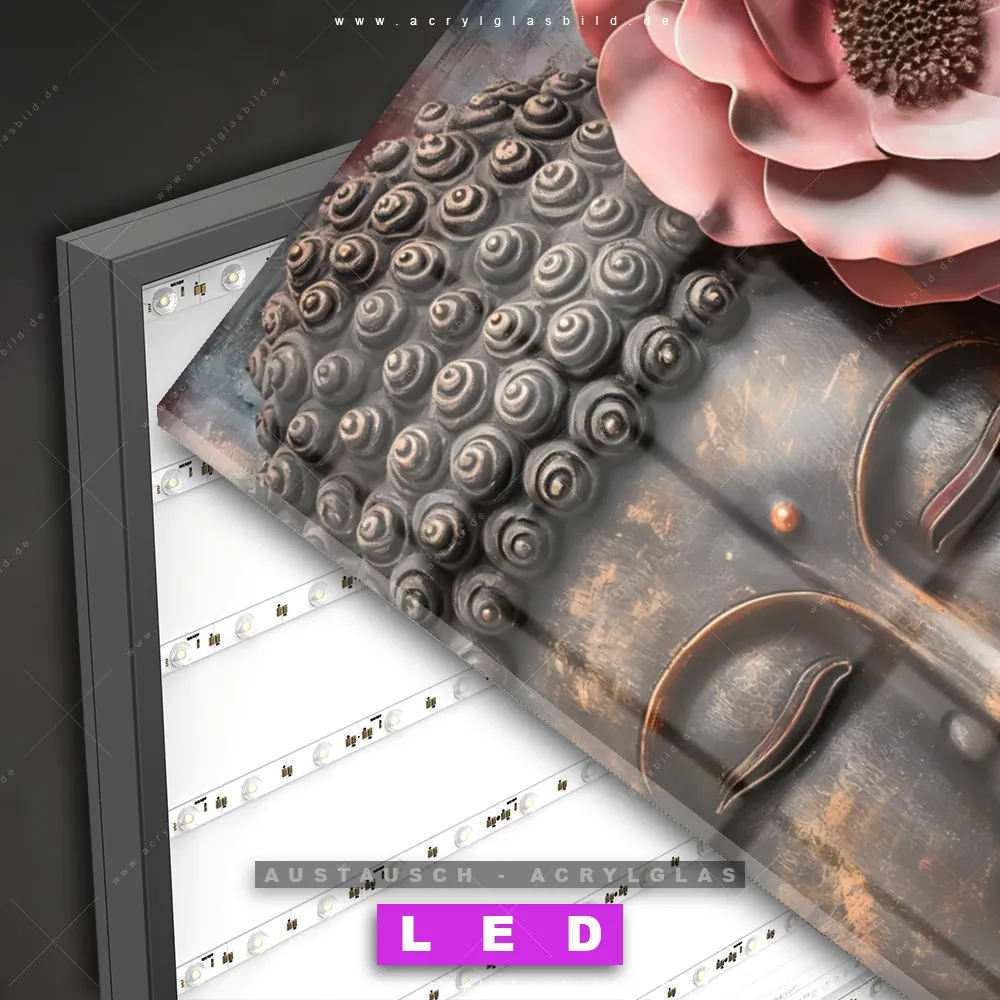 Begriffe wie Statue, Blüten, Buddhismus, Spirituell, Blumen, Buddha, Meditation, Religion haben dich auf der Suche nach deinem neuen Austausch-Acrylglasbild inspiriert? Dann sollte das Wechsel-Acrylglasbild Buddha-Statue und florale Kunst für dein bereits vorhandenes LED Acrylglasbild Canvalight® DIA den Weg zu dir finden.