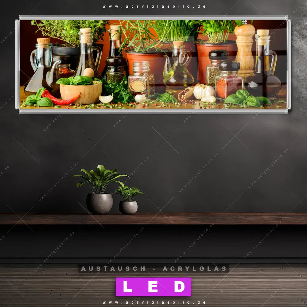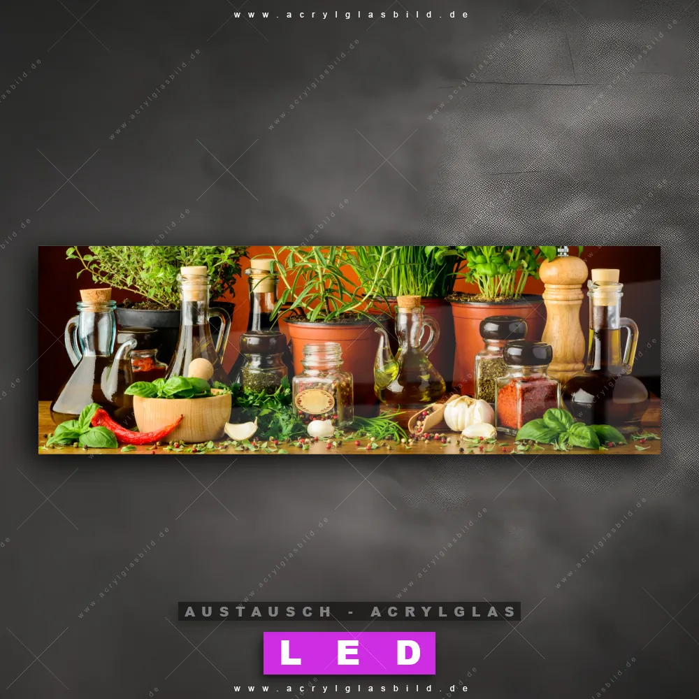 Begriffe wie Gewürze, Kräuter, kochen, Lebensmittel, mediterran, Rosmarin, Öl, Flaschen, gesund haben dich auf der Suche nach deinem neuen Austausch-Acrylglasbild inspiriert? Dann sollte das Wechsel-Acrylglasbild Gesunde Kräuter für dein bereits vorhandenes LED Acrylglasbild Canvalight® DIA den Weg zu dir finden.