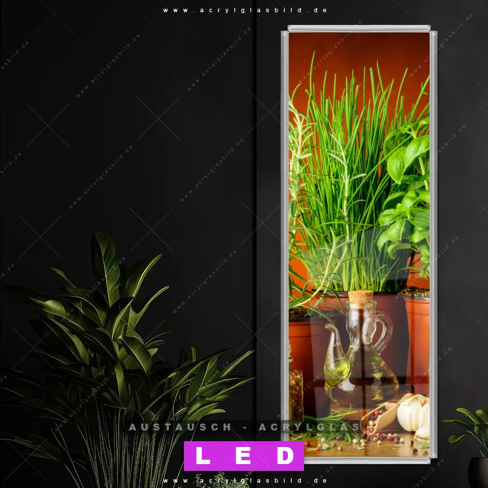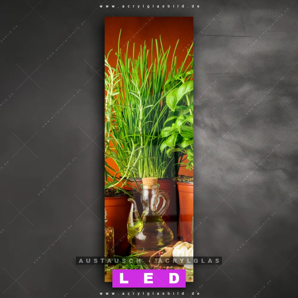 Begriffe wie Gewürze, Kräuter, kochen, Lebensmittel, mediterran, Rosmarin, Öl, Flaschen, gesund haben dich auf der Suche nach deinem neuen Austausch-Acrylglasbild inspiriert? Dann sollte das Wechsel-Acrylglasbild Gesunde Kräuter für dein bereits vorhandenes LED Acrylglasbild Canvalight® DIA den Weg zu dir finden.