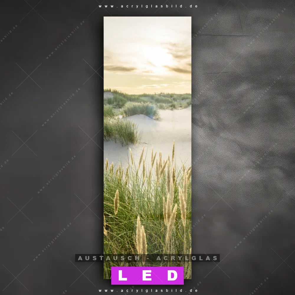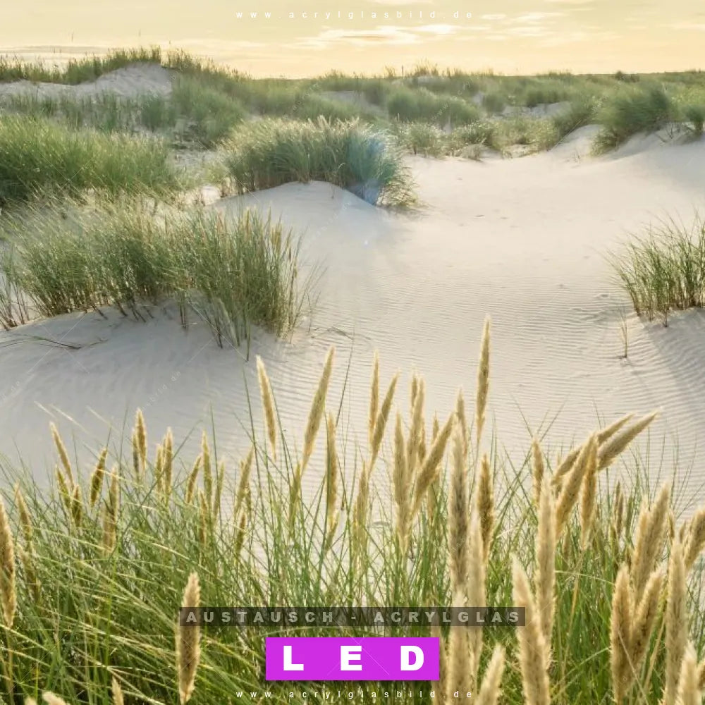 Begriffe wie Deutschland, Frühling, Sommer, Sonnenuntergang - Sonnenaufgang, Urlaub - Reisen, Ostsee - Nordsee, Dünen, Gräser haben dich auf der Suche nach deinem neuen Austausch-Acrylglasbild inspiriert? Dann sollte das Wechsel-Acrylglasbild Gräser am Nordseestrand für dein bereits vorhandenes LED Acrylglasbild Canvalight® DIA den Weg zu dir finden.