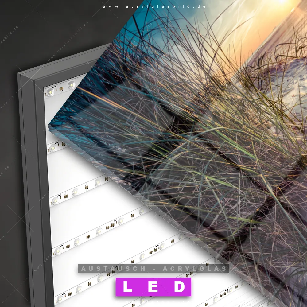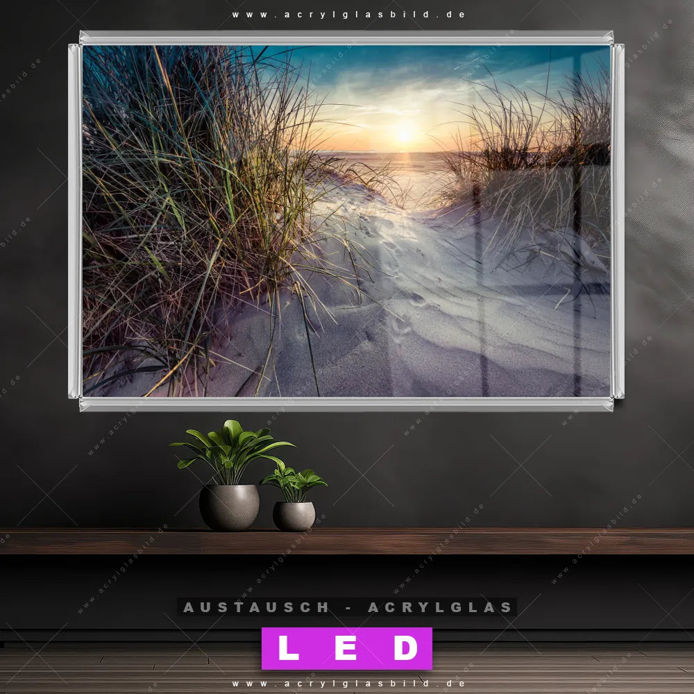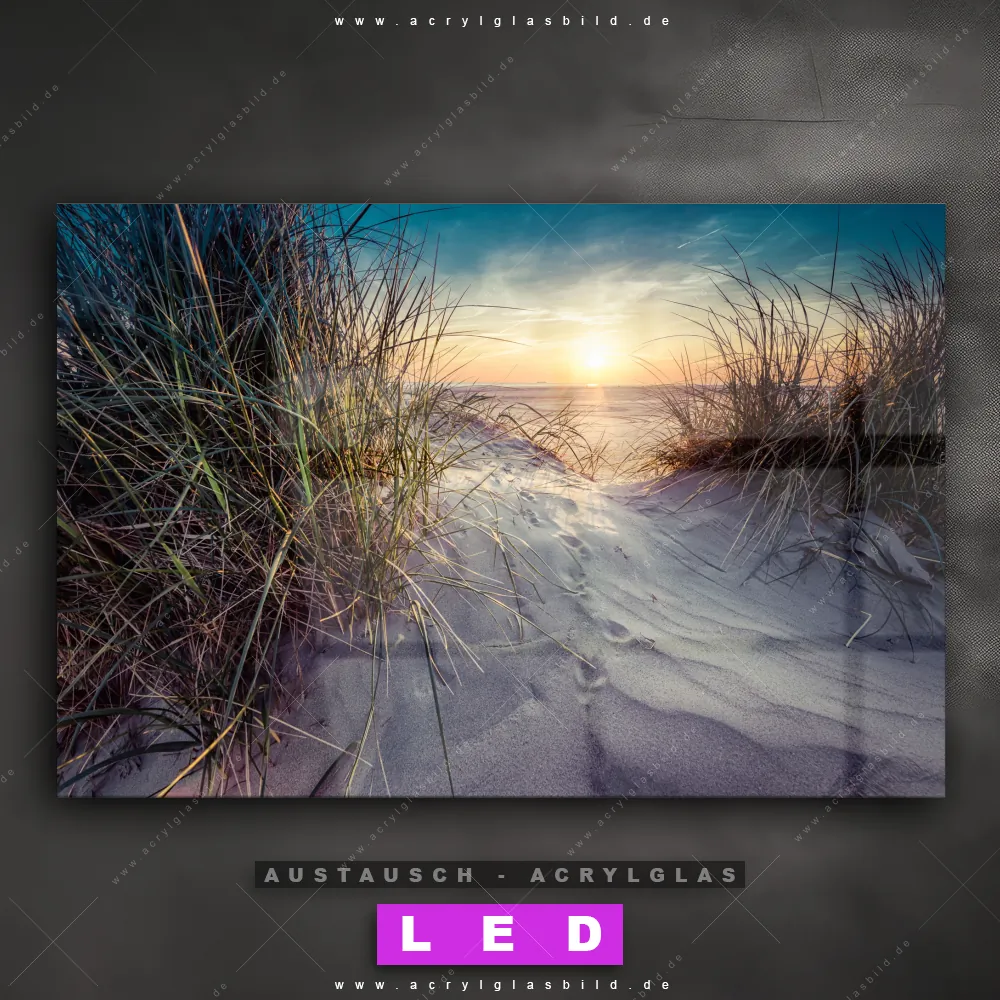 Begriffe wie Meer, Sonnenuntergang, Strand, Nordsee, Ostsee, Düne, Gras, Deutschland, Reise, Herbst, Sommer haben dich auf der Suche nach deinem neuen Austausch-Acrylglasbild inspiriert? Dann sollte das Wechsel-Acrylglasbild Gräser im Küstensand für dein bereits vorhandenes LED Acrylglasbild Canvalight® DIA den Weg zu dir finden.