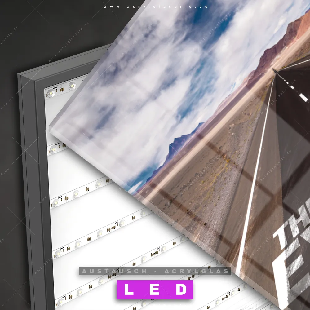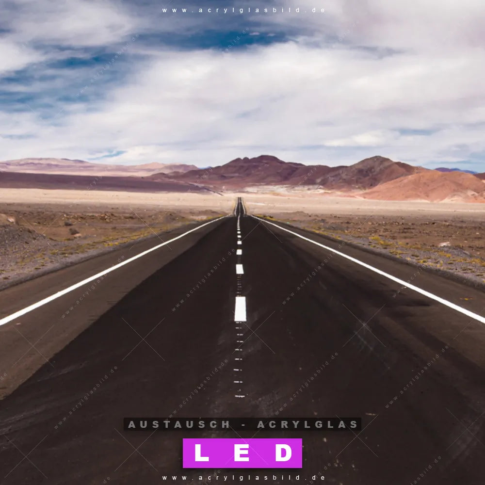 Begriffe wie Küste, Horizont, Landschaft, Urlaub, Reisen, Motivation, Straße, Weg, Berge, Himmel haben dich auf der Suche nach deinem neuen Austausch-Acrylglasbild inspiriert? Dann sollte das Wechsel-Acrylglasbild Weg zur Zukunft für dein bereits vorhandenes LED Acrylglasbild Canvalight® DIA den Weg zu dir finden.