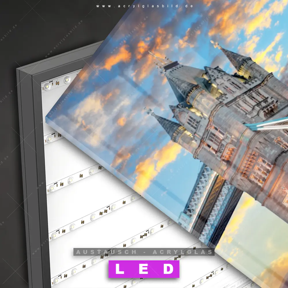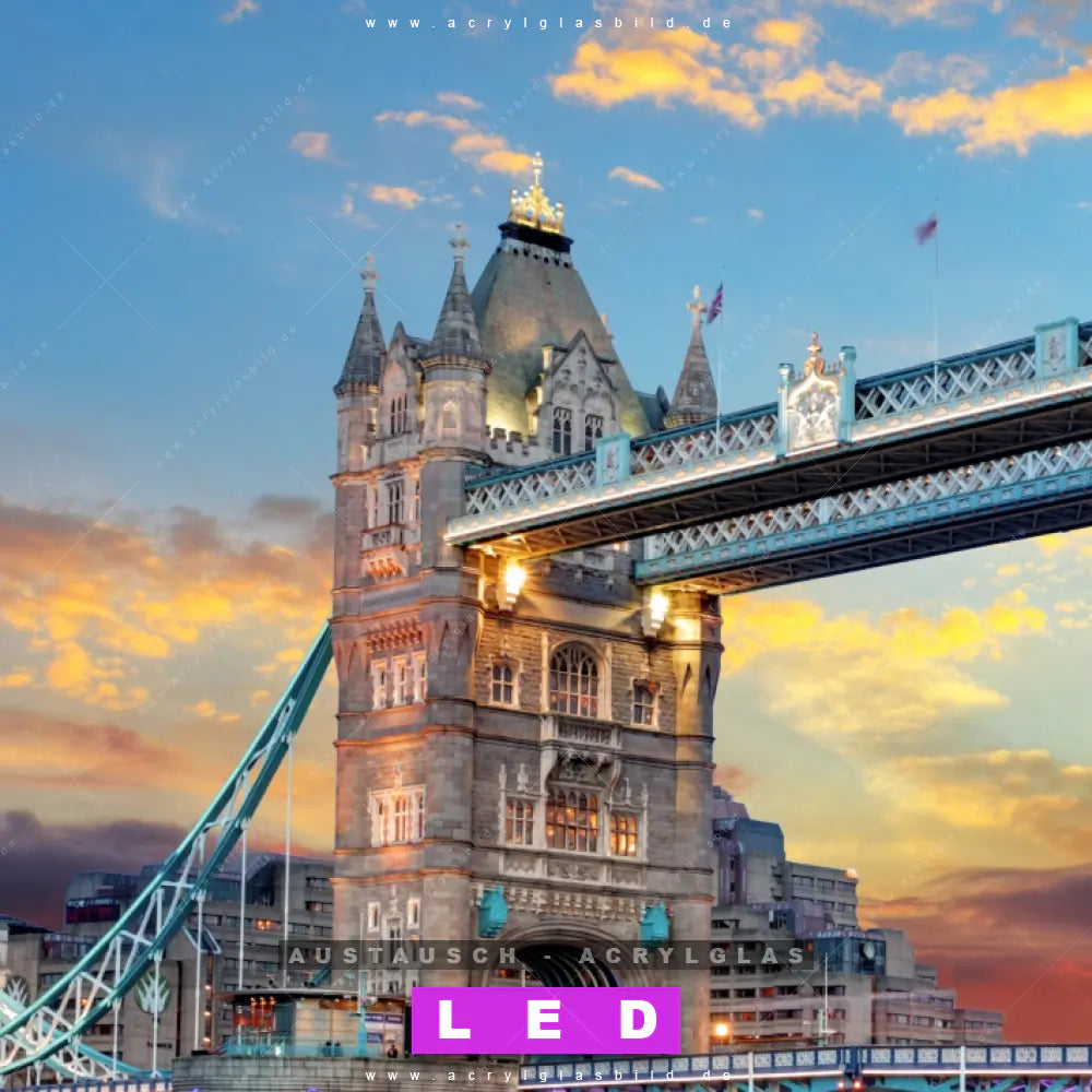 Begriffe wie Sehenswürdigkeiten, Big Ben, Großbritannien, Westminster, London, England, Brücke, Themse, Tower Bridge, Sonnenuntergang, Sehenswürdigkeit, Fluss, Metropole, Stadt, Wahrzeichen haben dich auf der Suche nach deinem neuen Austausch-Acrylglasbild inspiriert? Dann sollte das Wechsel-Acrylglasbild Londoner Wahrzeichen bei Sonnenuntergang für dein bereits vorhandenes LED Acrylglasbild Canvalight® DIA den Weg zu dir finden.