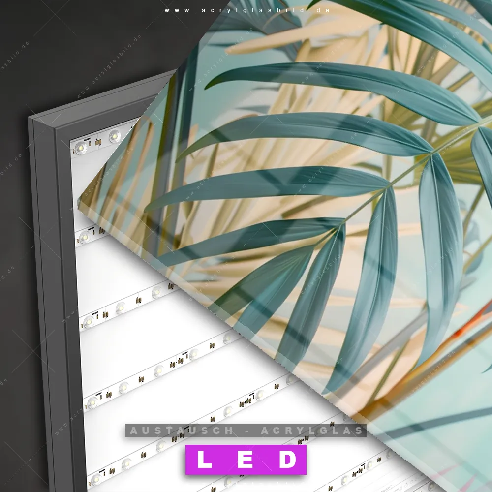 Begriffe wie Monstera, Palmenblätter, Blätter, Pflanze, Natur, Nahaufnahme, Dschungel haben dich auf der Suche nach deinem neuen Austausch-Acrylglasbild inspiriert? Dann sollte das Wechsel-Acrylglasbild Exotische Palmen-Blätter für dein bereits vorhandenes LED Acrylglasbild Canvalight® DIA den Weg zu dir finden.