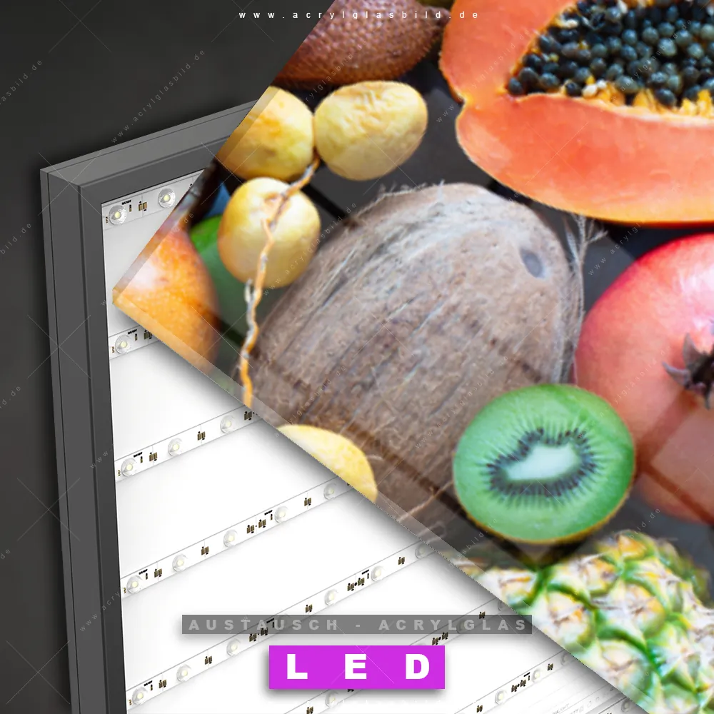 Begriffe wie Obst, Zitrusfrüchte, Früchte, Kiwi, frisch, Banane, Ananas, Kokosnuss, Tropfen, Orange, Mango haben dich auf der Suche nach deinem neuen Austausch-Acrylglasbild inspiriert? Dann sollte das Wechsel-Acrylglasbild Vielfalt an Obst für dein bereits vorhandenes LED Acrylglasbild Canvalight® DIA den Weg zu dir finden.