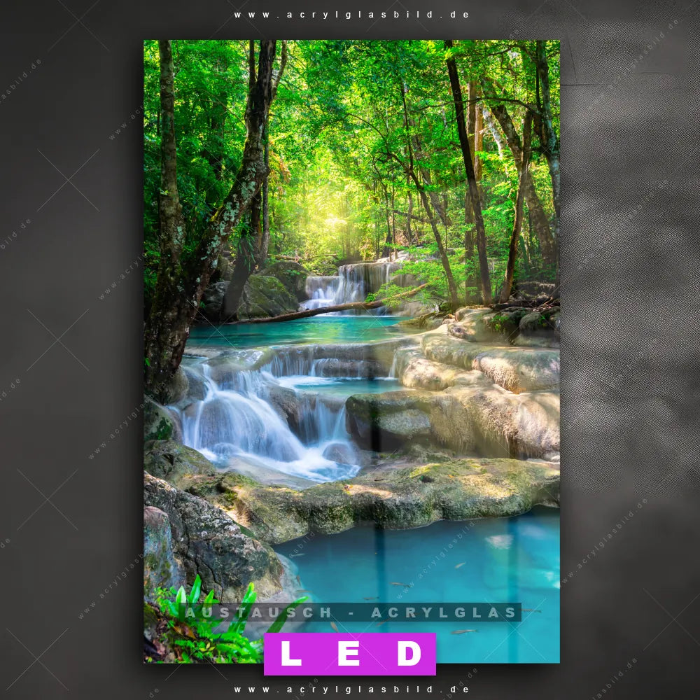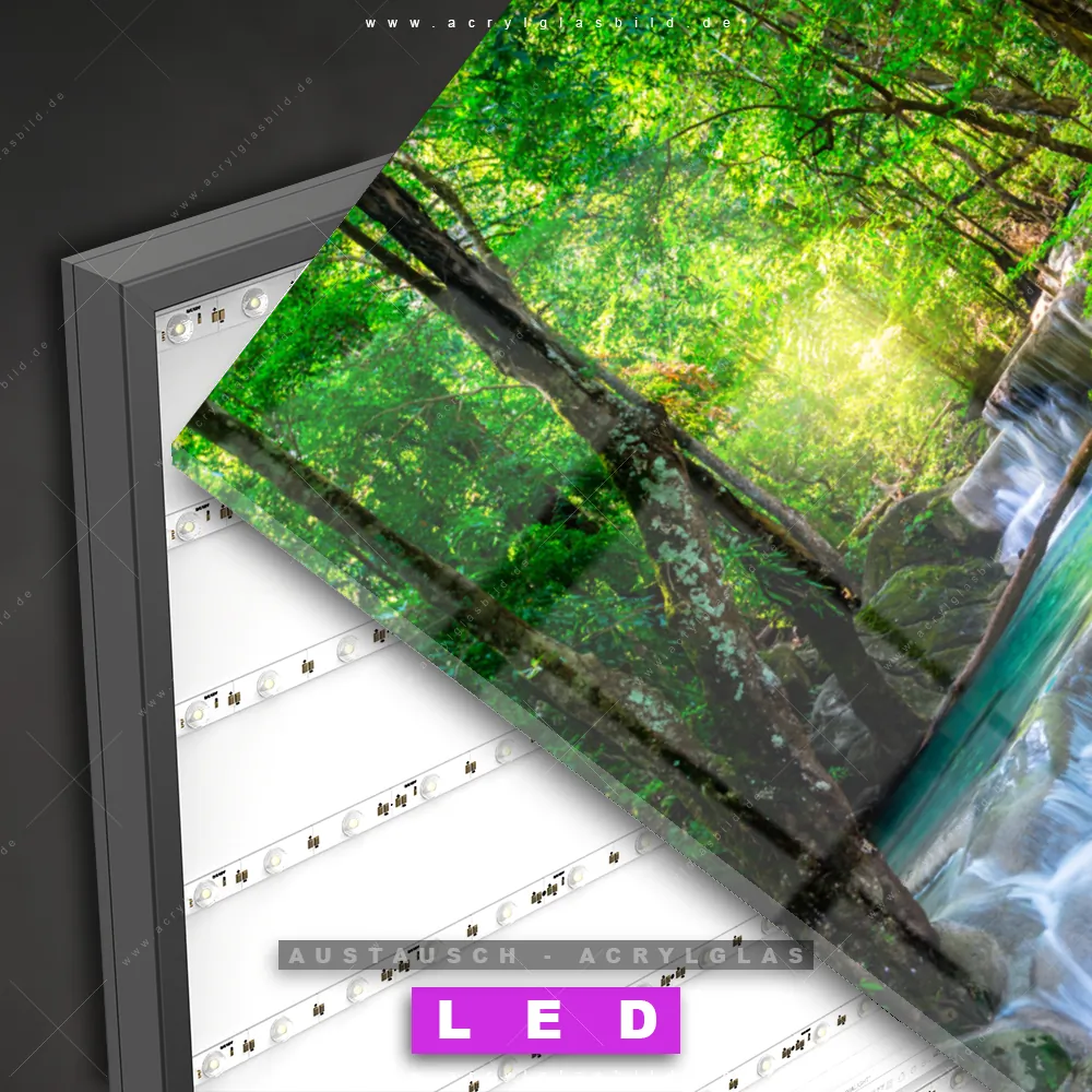Begriffe wie Wald, Landschaft, Bäume, Natur, Baum, Ruhe, Stille, Wasserfall, Fluss haben dich auf der Suche nach deinem neuen Austausch-Acrylglasbild inspiriert? Dann sollte das Wechsel-Acrylglasbild kleine Wasserfälle im Wald für dein bereits vorhandenes LED Acrylglasbild Canvalight® DIA den Weg zu dir finden.