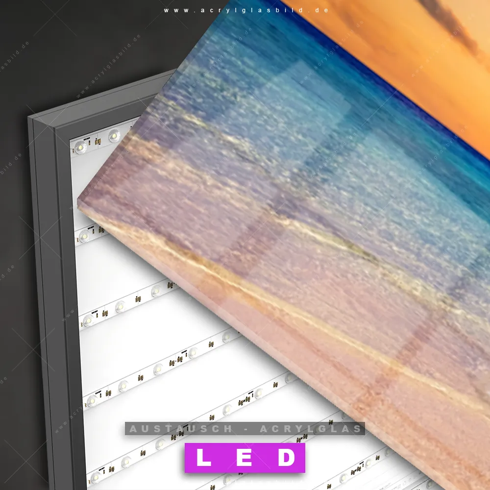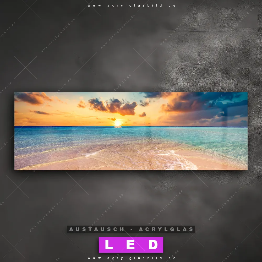Begriffe wie Ozean, Wasser, Küste, Horizont, Sand, Sonne, Nordsee, Ostsee, Mittelmeer, Insel, Malediven, Südsee - Karibik, Urlaub - Reisen, Sonnenuntergang - Sonnenaufgang haben dich auf der Suche nach deinem neuen Austausch-Acrylglasbild inspiriert? Dann sollte das Wechsel-Acrylglasbild Meer im Sonnenuntergang für dein bereits vorhandenes LED Acrylglasbild Canvalight® DIA den Weg zu dir finden.