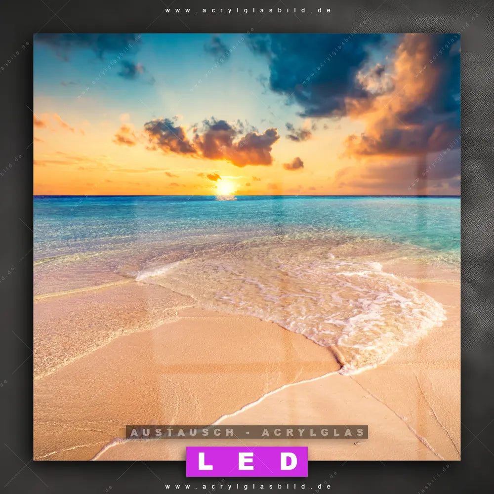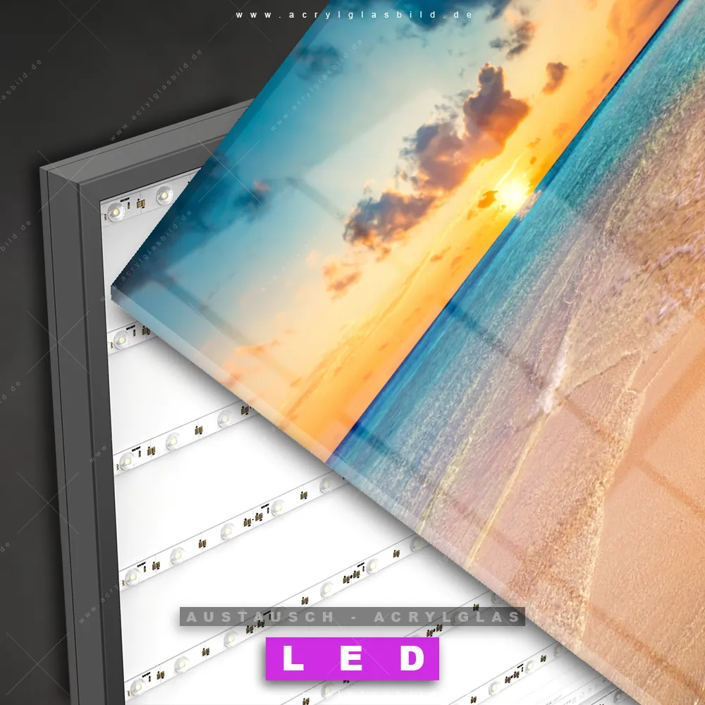 Begriffe wie Ozean, Wasser, Küste, Horizont, Sand, Sonne, Nordsee, Ostsee, Mittelmeer, Insel, Malediven, Südsee - Karibik, Urlaub - Reisen, Sonnenuntergang - Sonnenaufgang haben dich auf der Suche nach deinem neuen Austausch-Acrylglasbild inspiriert? Dann sollte das Wechsel-Acrylglasbild Meer im Sonnenuntergang für dein bereits vorhandenes LED Acrylglasbild Canvalight® DIA den Weg zu dir finden.