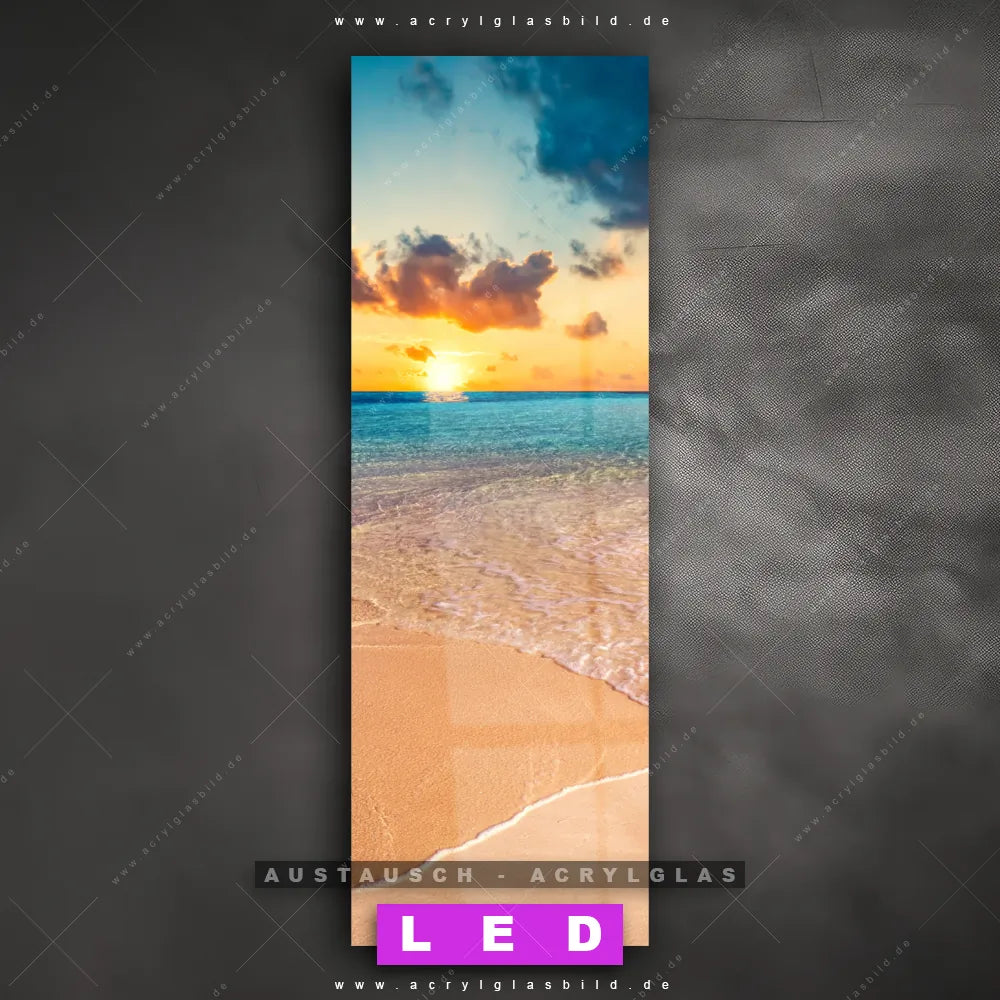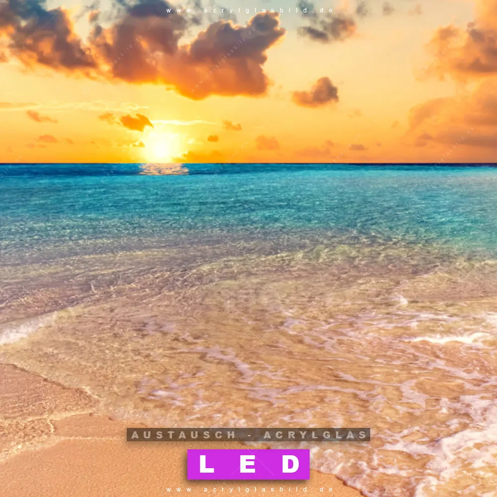 Begriffe wie Ozean, Wasser, Küste, Horizont, Sand, Sonne, Nordsee, Ostsee, Mittelmeer, Insel, Malediven, Südsee - Karibik, Urlaub - Reisen, Sonnenuntergang - Sonnenaufgang haben dich auf der Suche nach deinem neuen Austausch-Acrylglasbild inspiriert? Dann sollte das Wechsel-Acrylglasbild Meer im Sonnenuntergang für dein bereits vorhandenes LED Acrylglasbild Canvalight® DIA den Weg zu dir finden.