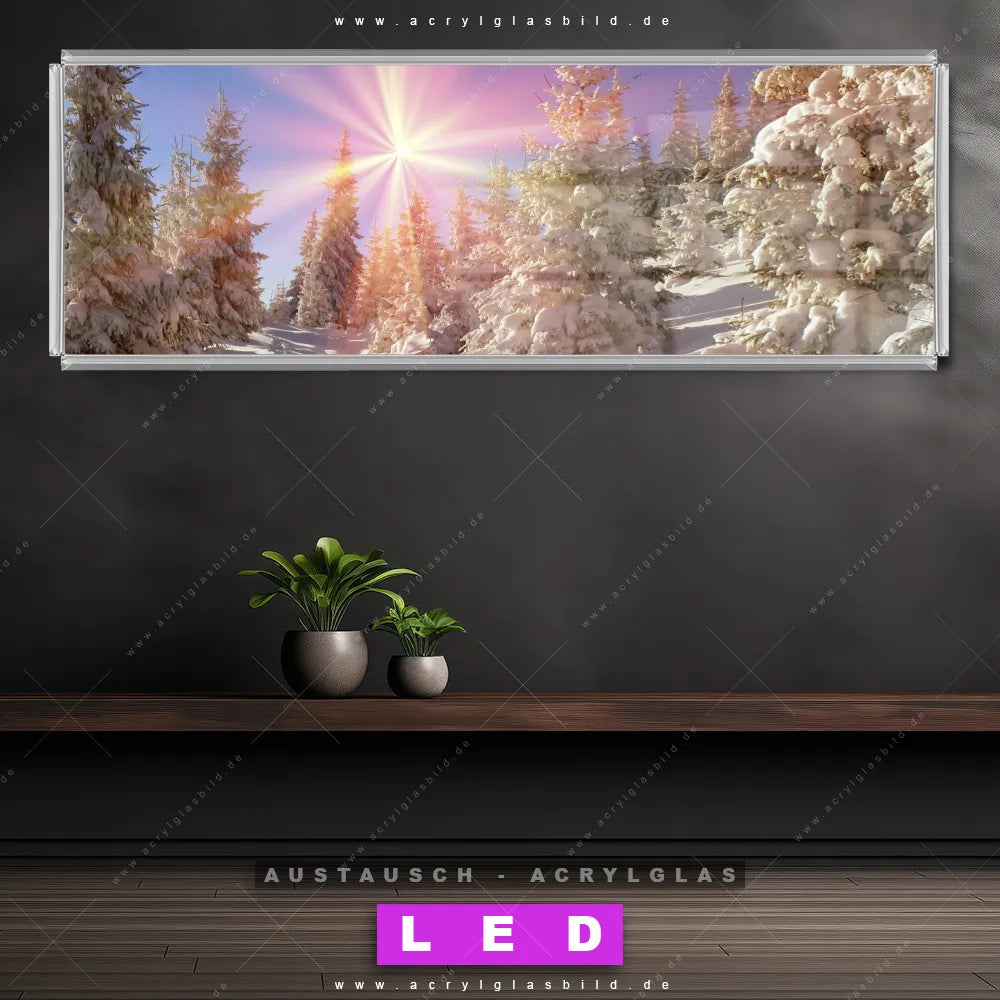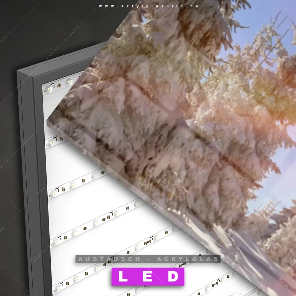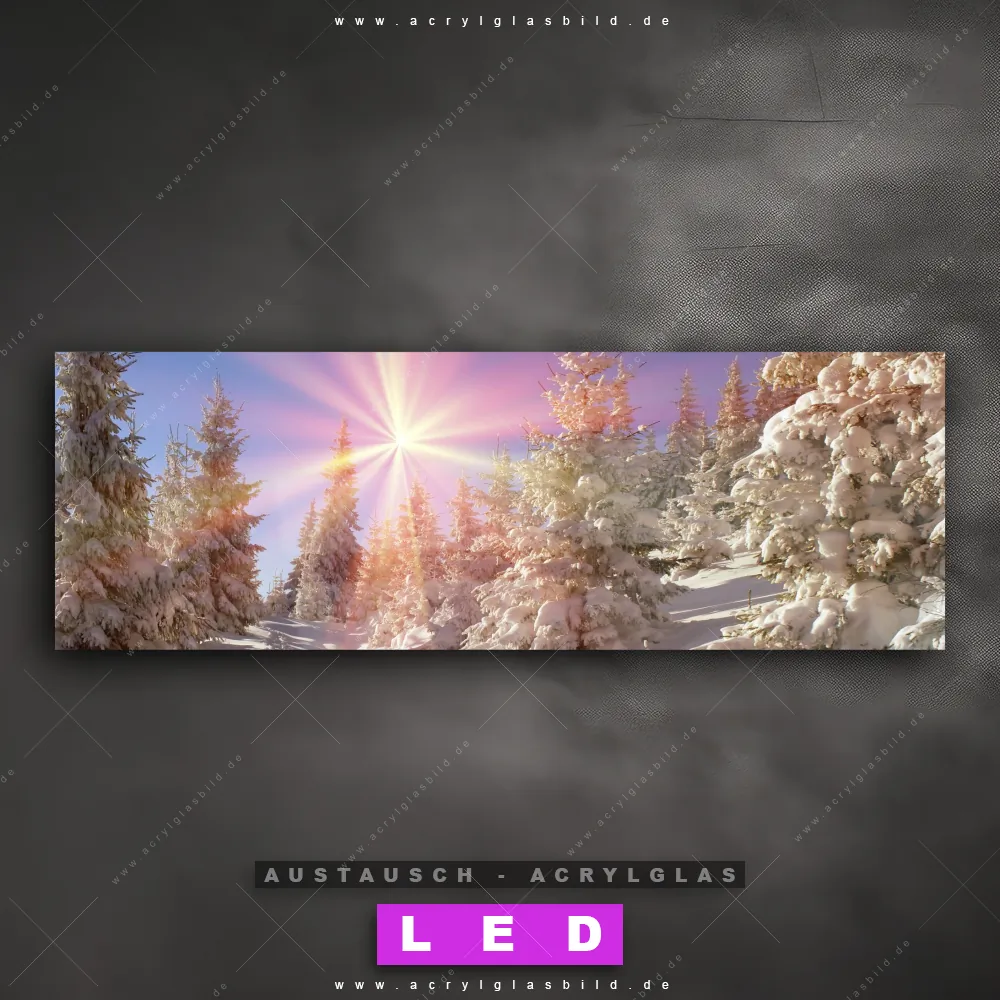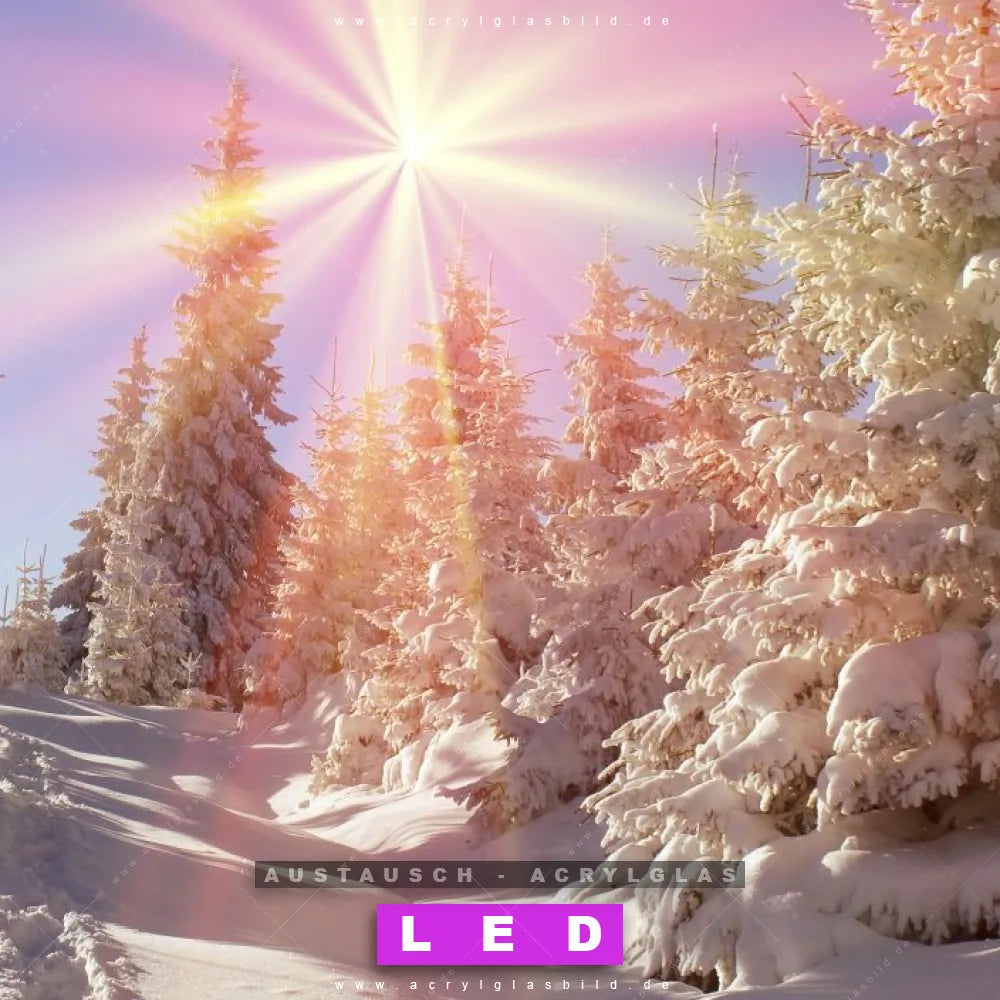 Begriffe wie Schneelandschaft, Winter, Schnee, Sonnenaufgang, Weihnachten, Nadelwald, Wald, Sonnenlicht, Bäume haben dich auf der Suche nach deinem neuen Austausch-Acrylglasbild inspiriert? Dann sollte das Wechsel-Acrylglasbild Nadelbäume mit Schnee bedeckt für dein bereits vorhandenes LED Acrylglasbild Canvalight® DIA den Weg zu dir finden.