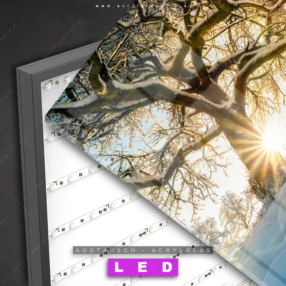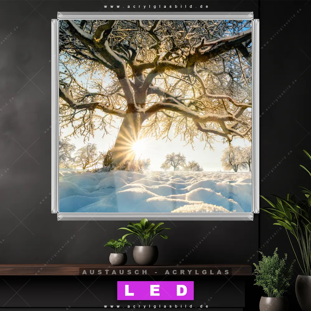 Begriffe wie Baum, Schneelandschaft, Winter, Schnee, Sonnenaufgang, Sonnenlicht, Bäume haben dich auf der Suche nach deinem neuen Austausch-Acrylglasbild inspiriert? Dann sollte das Wechsel-Acrylglasbild Schneebedeckter alter Baum für dein bereits vorhandenes LED Acrylglasbild Canvalight® DIA den Weg zu dir finden.